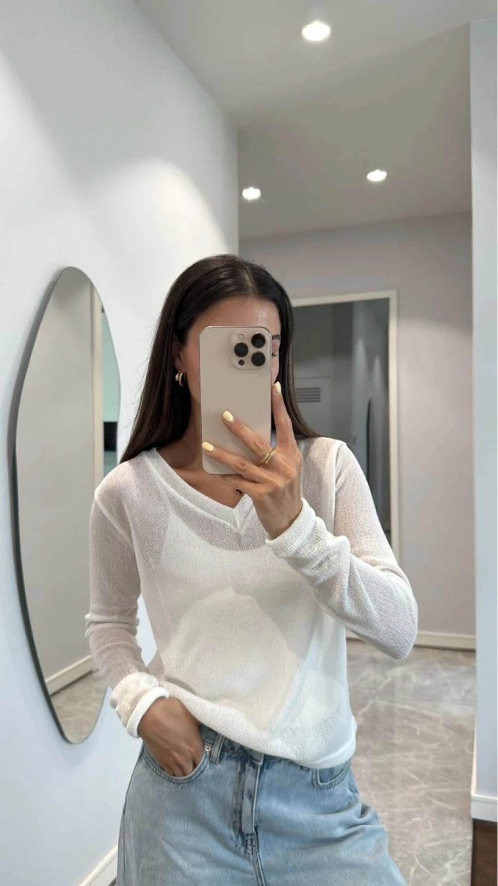 V Yaka uzun Kollu Triko ince Bluz - Beyaz