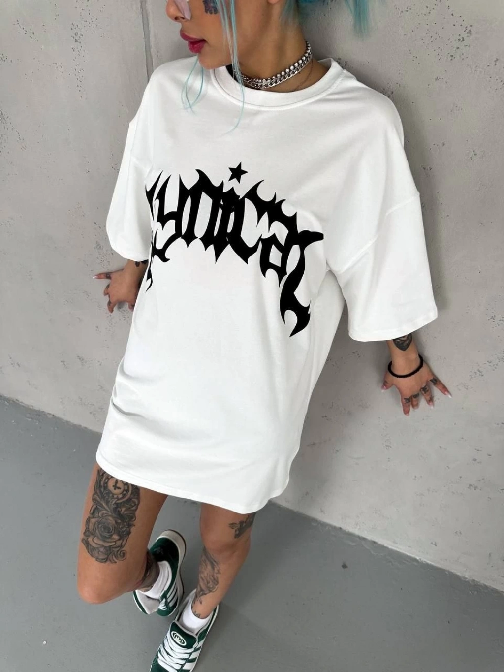 Bisiklet Yaka Baskılı Oversize T-Shirt - Beyaz -