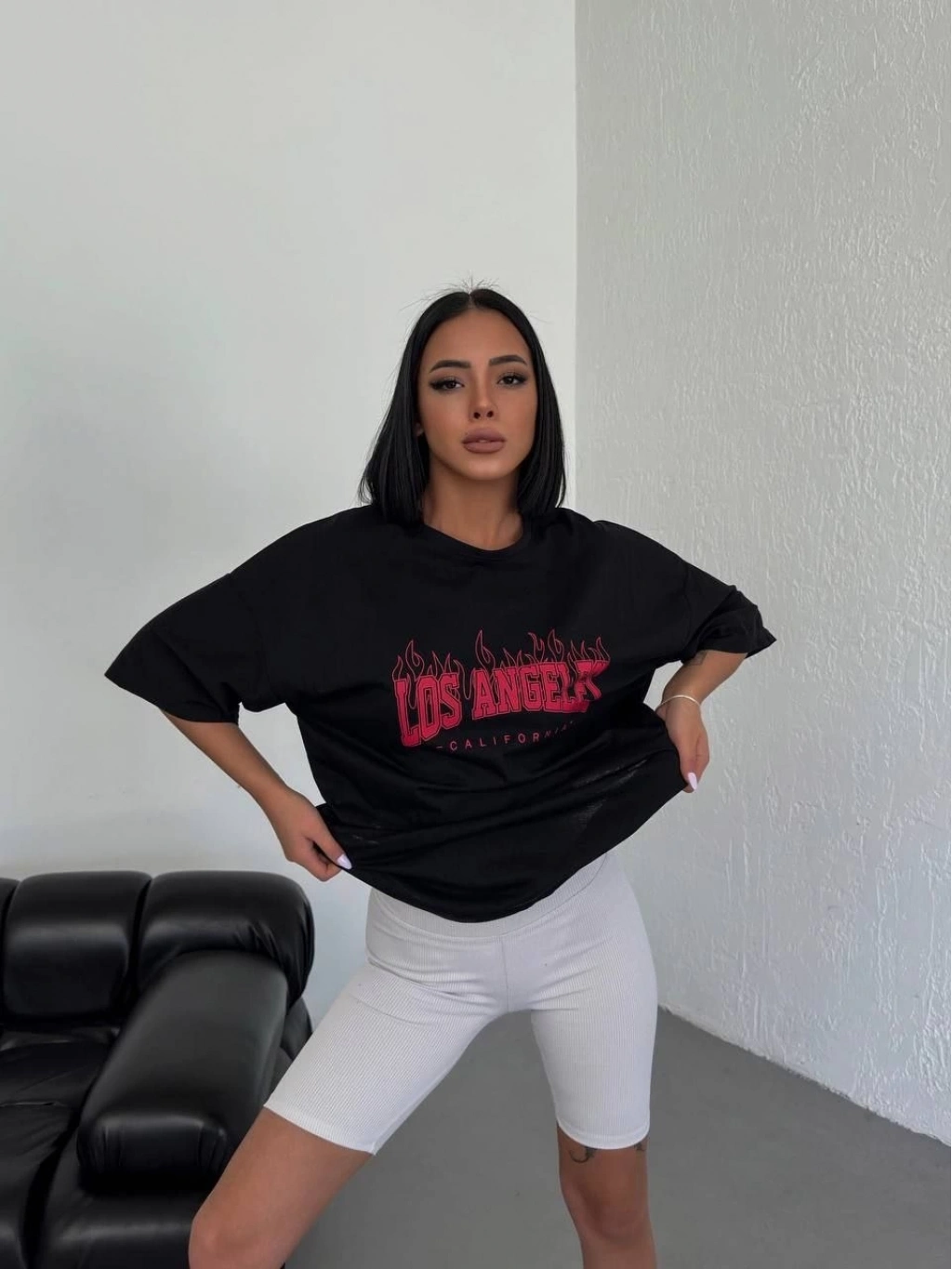 Bisiklet Yaka Baskılı Oversize T-Shirt - Siyah -