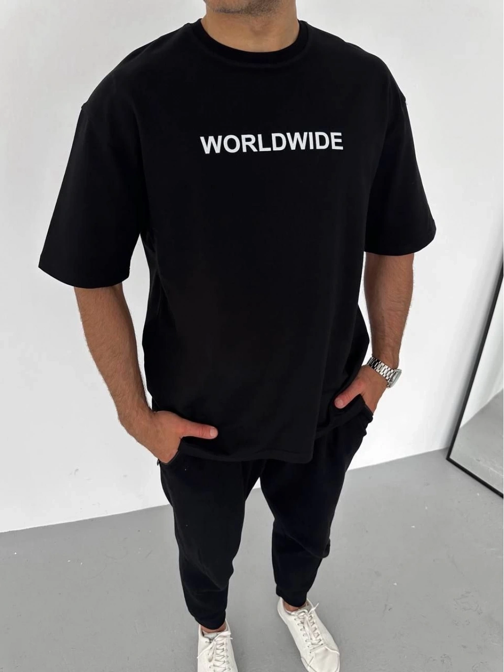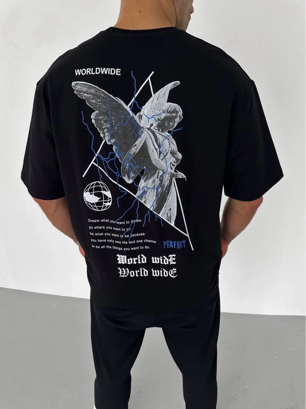 Bisiklet Yaka Baskılı Oversize T-Shirt - Siyah -