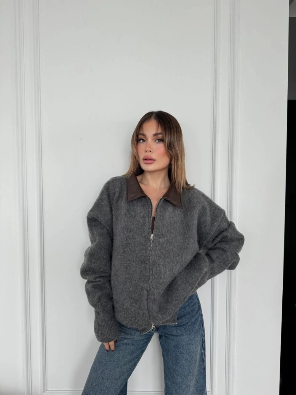 Deri Yakalı Pamuk dokulu Çift Taraflı Çalışan Fermuar Ceket - Füme -