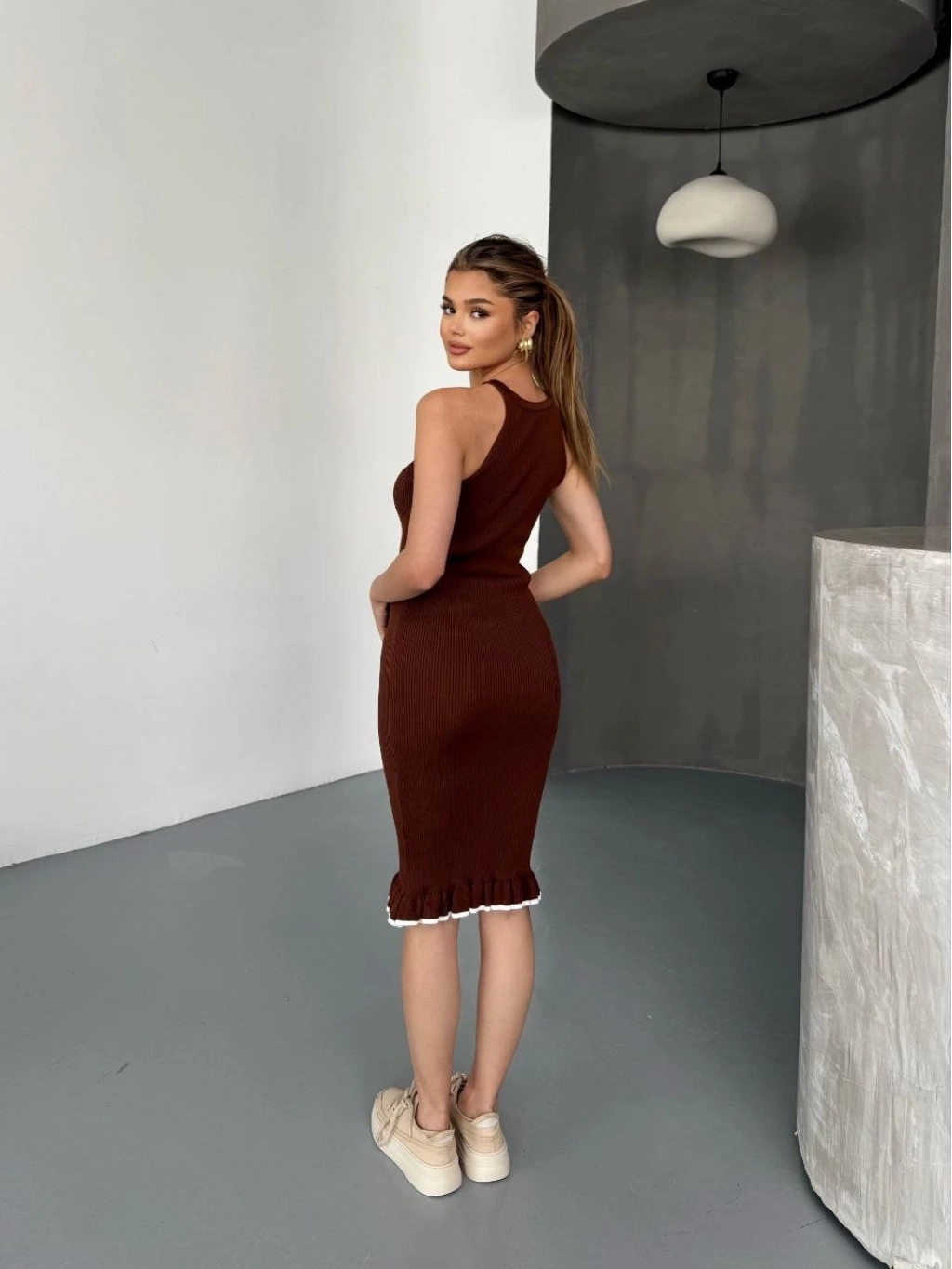 Fırfır Detaylı Triko Elbise- Kahverengi -
