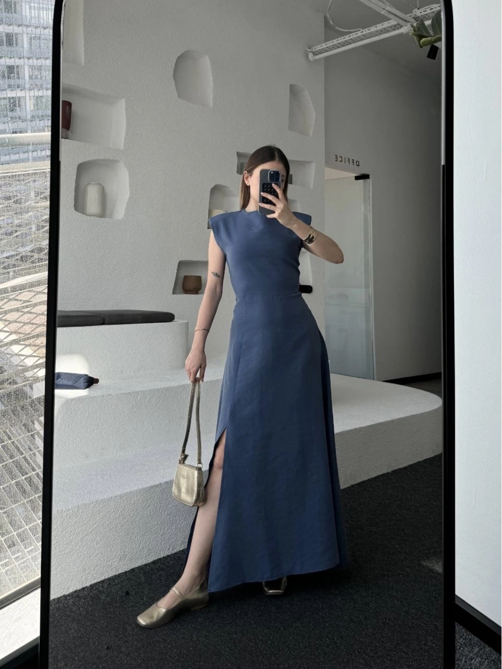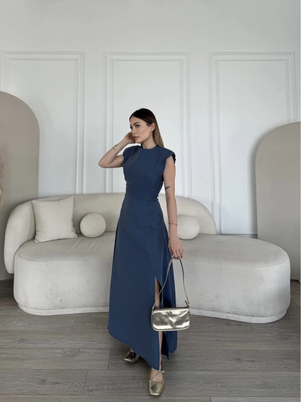 Keten Yandan Yırtmaçlı Uzun Elbise Sıfır Kol Elbise - Mavi -