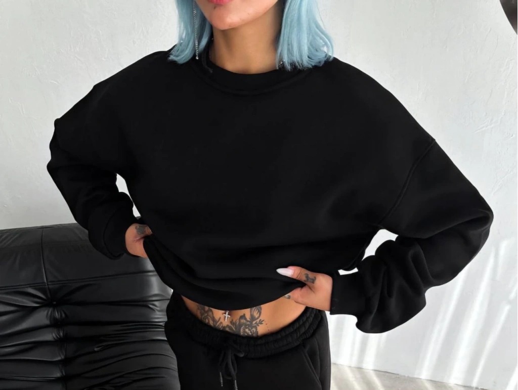 Kışlık Bisiklet Yaka Üç İplik Basic SweatShirt - Siyah -