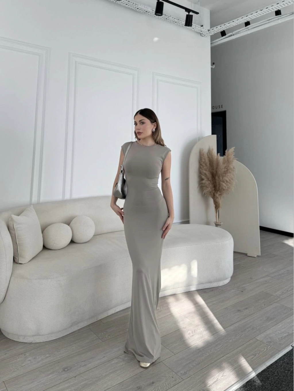 Kolsuz Uzun Likralı Elbise - Gri -