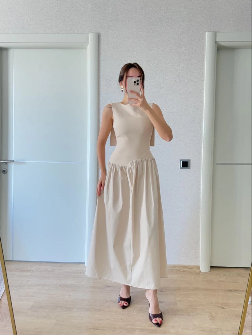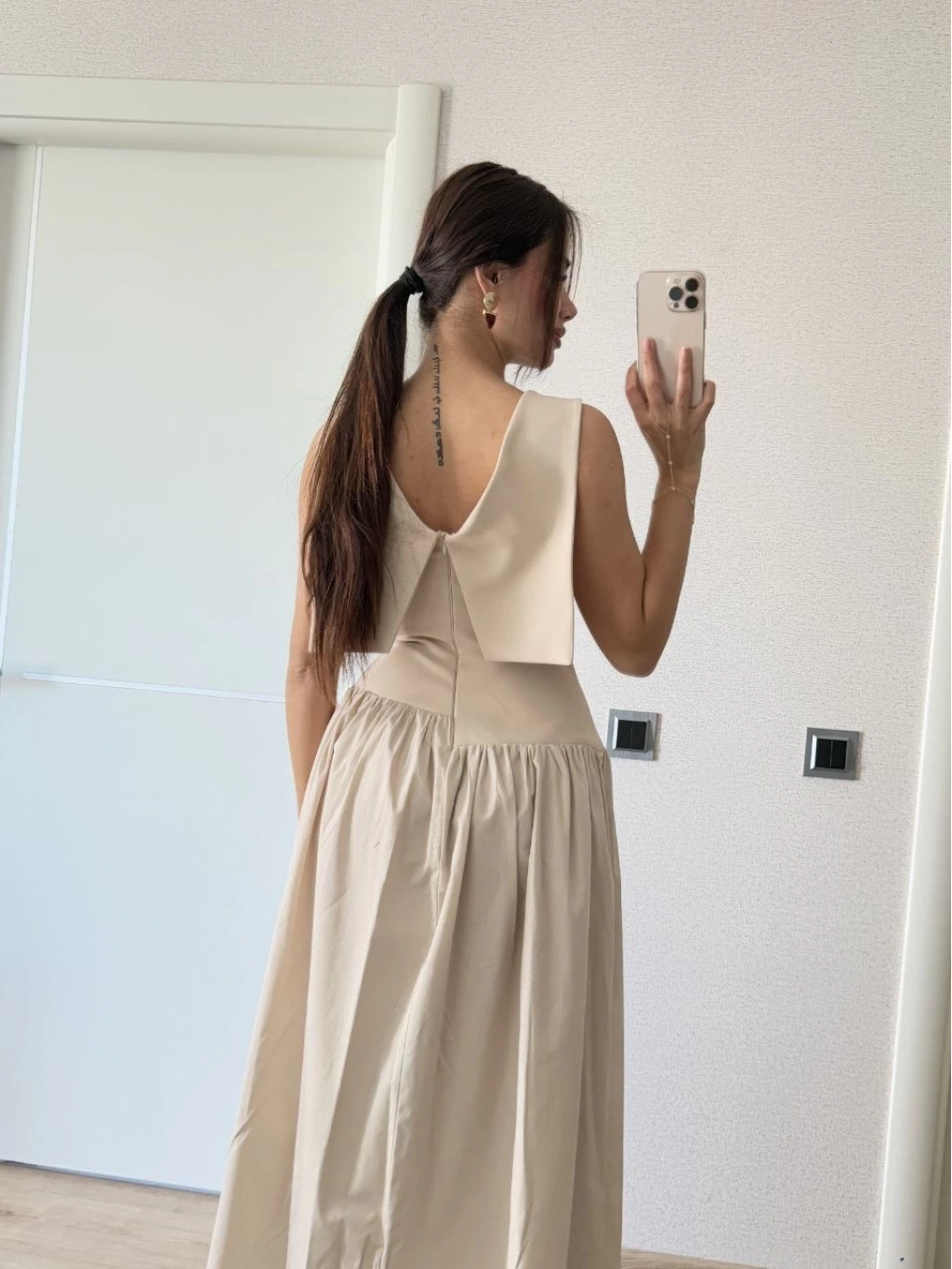 Krep Arkası Kanat Arka Ön Pens Detaylı Uzun Elbise - Bej -