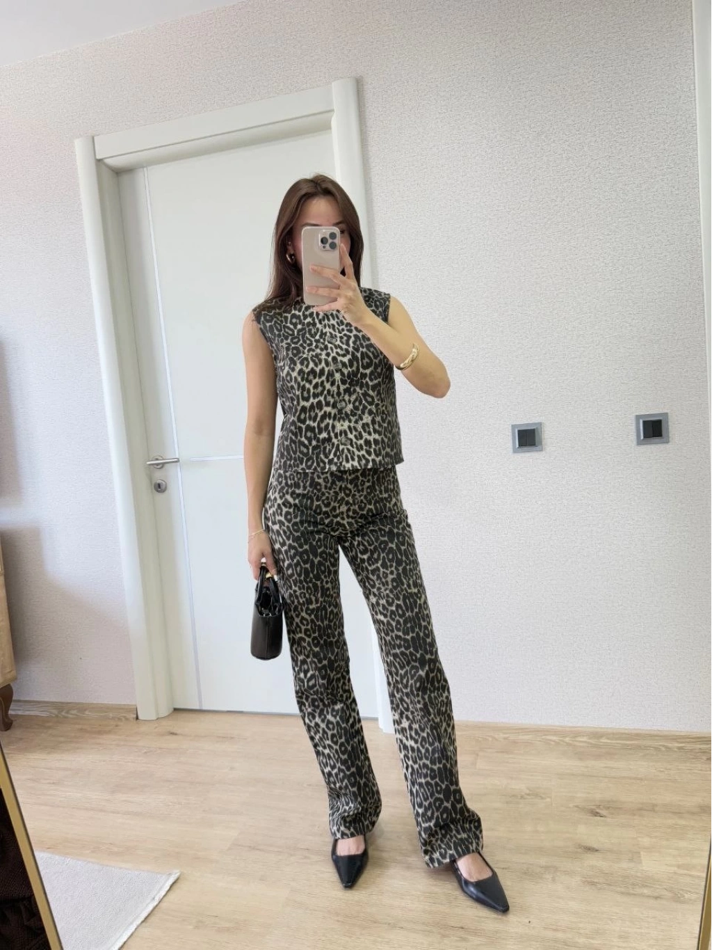 leopar desenli Düğmeli Bluzlu Pantolon İkili Takım -Leopar -