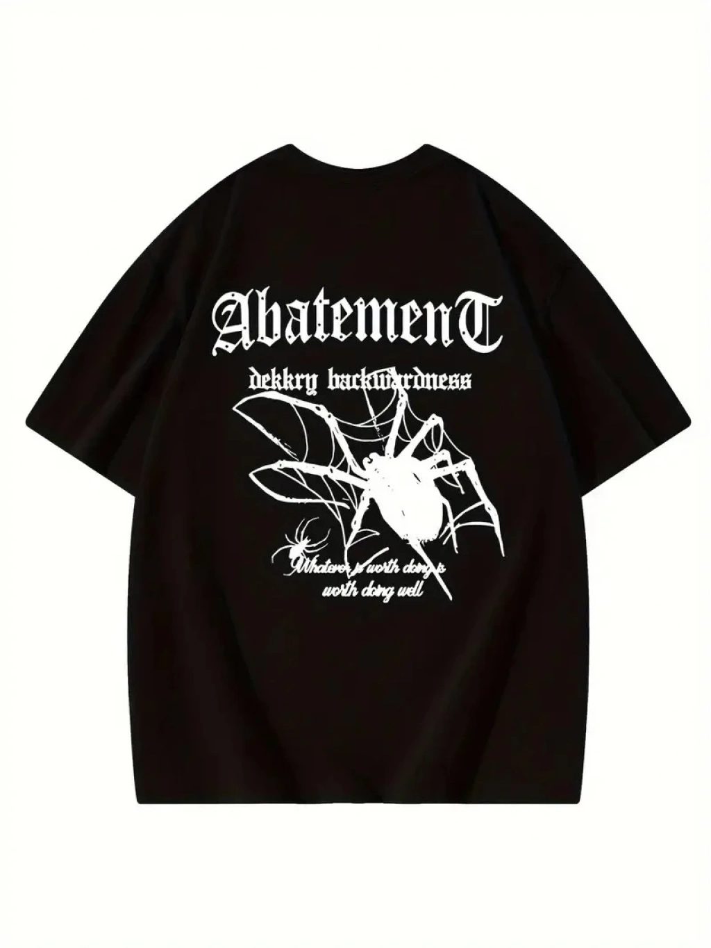 Örümcek Ağı Desenli Baskılı Oversize Bisiklet Yaka T-shirt - Siyah -