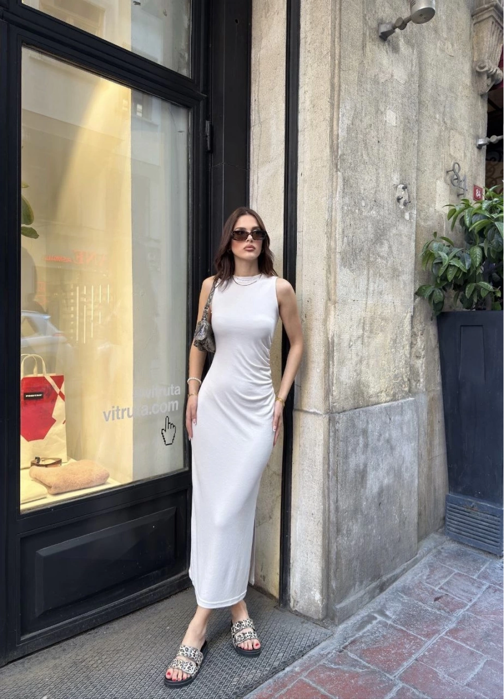 Osy Modal Yumuşak Dokulu Kumaş Bisiklet Yaka Sıfır Kolsuz Yırtmaçlı Uzun Elbise - Beyaz -