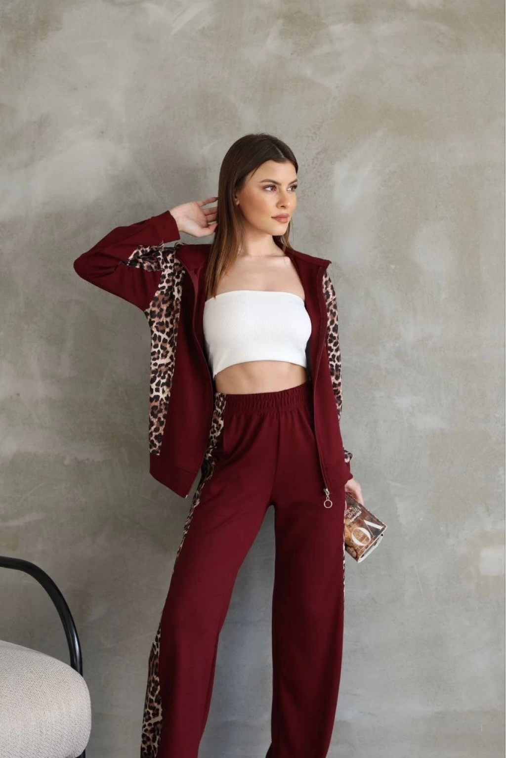 Osy Modal Yumuşak Dokulu Kumaş Kapüşonlu Leopar Desenli Fermuarlı Takım - Bordo -