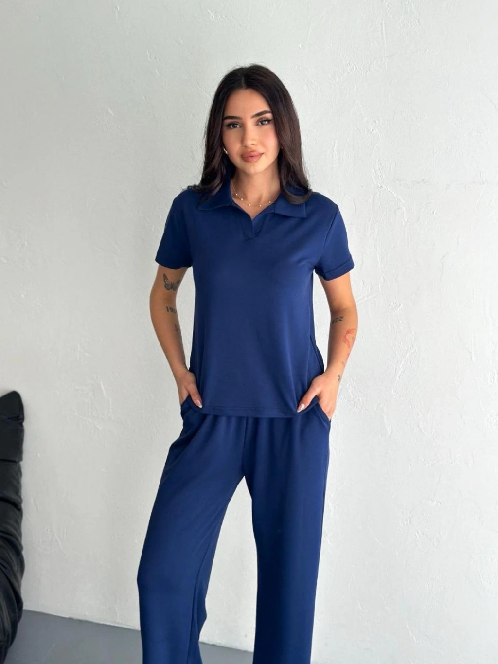 Osy Modal Yumuşak Dokulu Kumaş Kısa Kollu Yakalı T-shirt Pantalon ikili Takım- Lacivert -