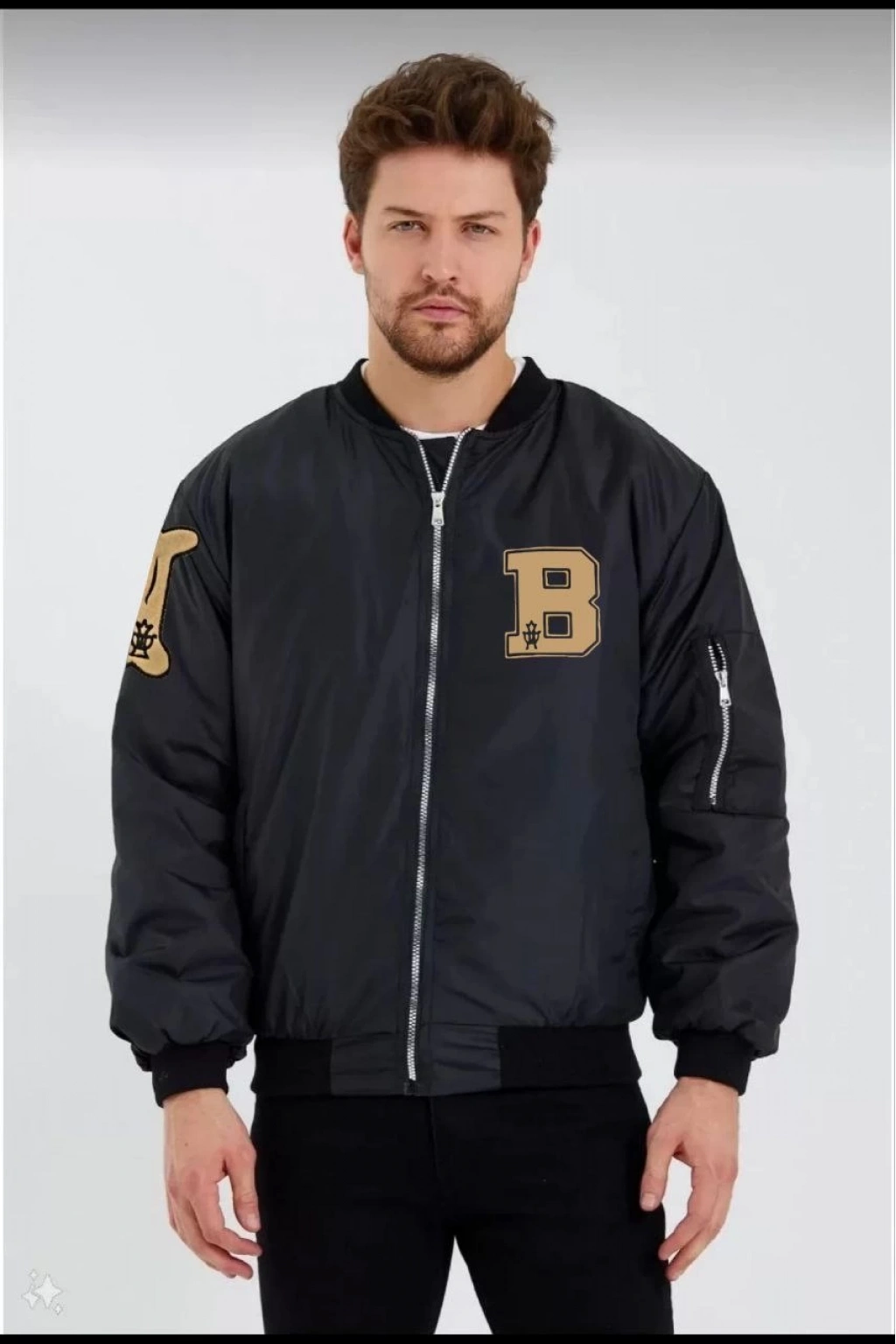 Siyah Bomber Kolej Mont – B Harfi ve Kemik Baskılı -