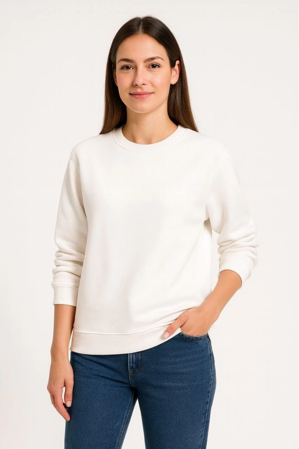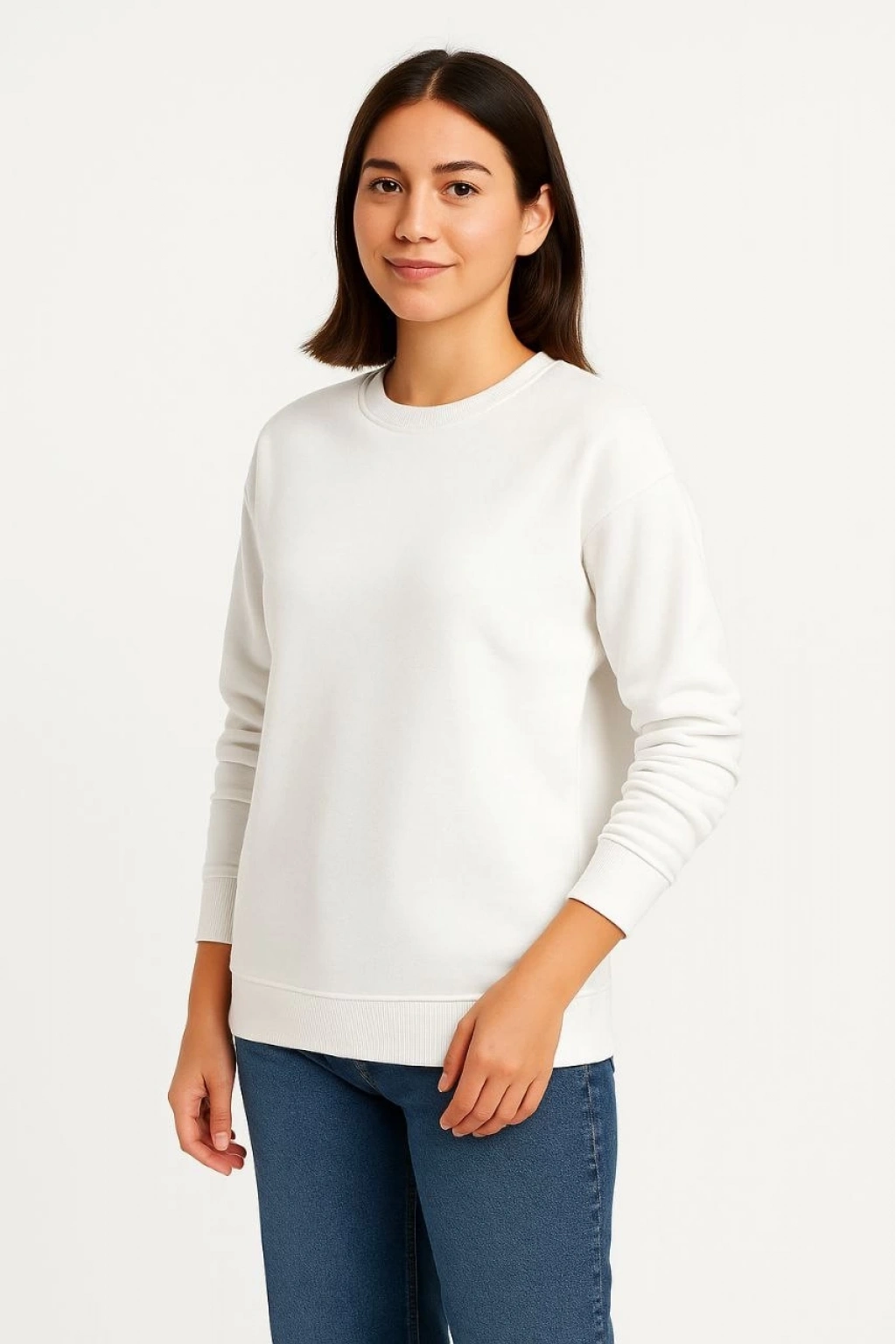 Üç İplik Düz Bisiklet Yaka SweatShirt - Beyaz -