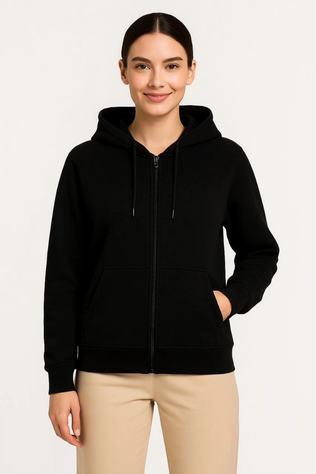 Üç İplik Kapüşonlu Tam Fermuarlı Kanguru Çepli SweatShirt Hoodie - Siyah -