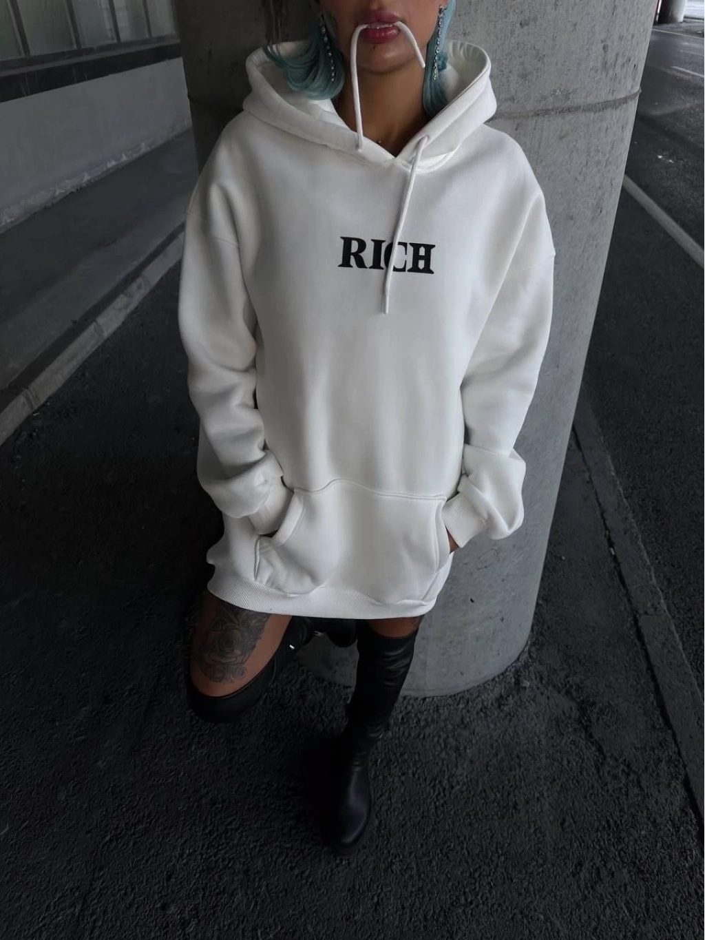 Uzun Kol Kapüşonlu Göğüs Baskılı SweatShirt - Beyaz -