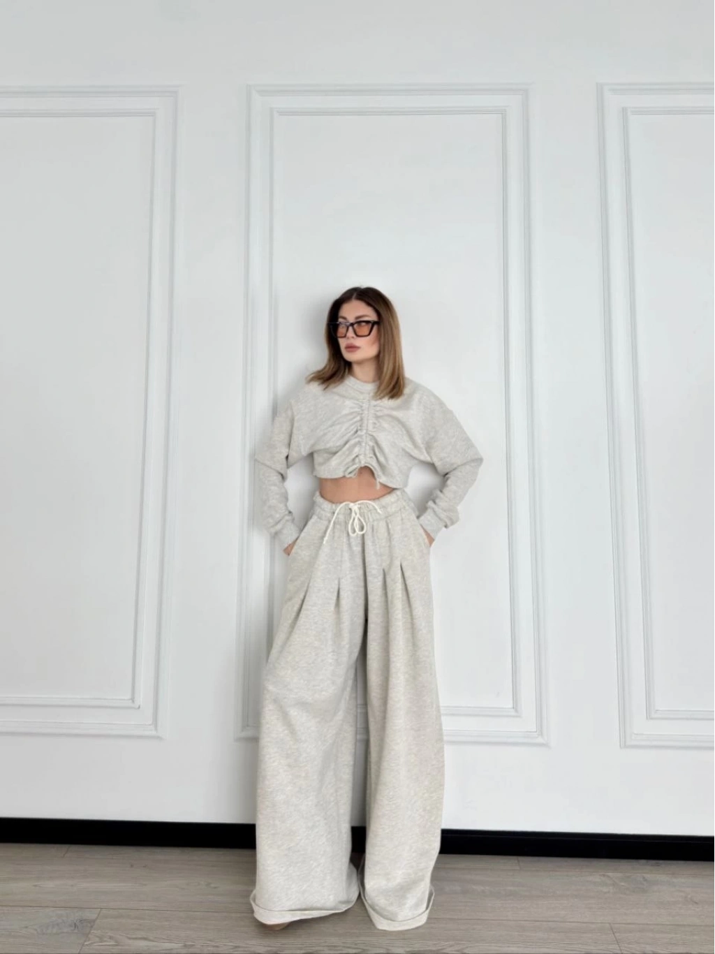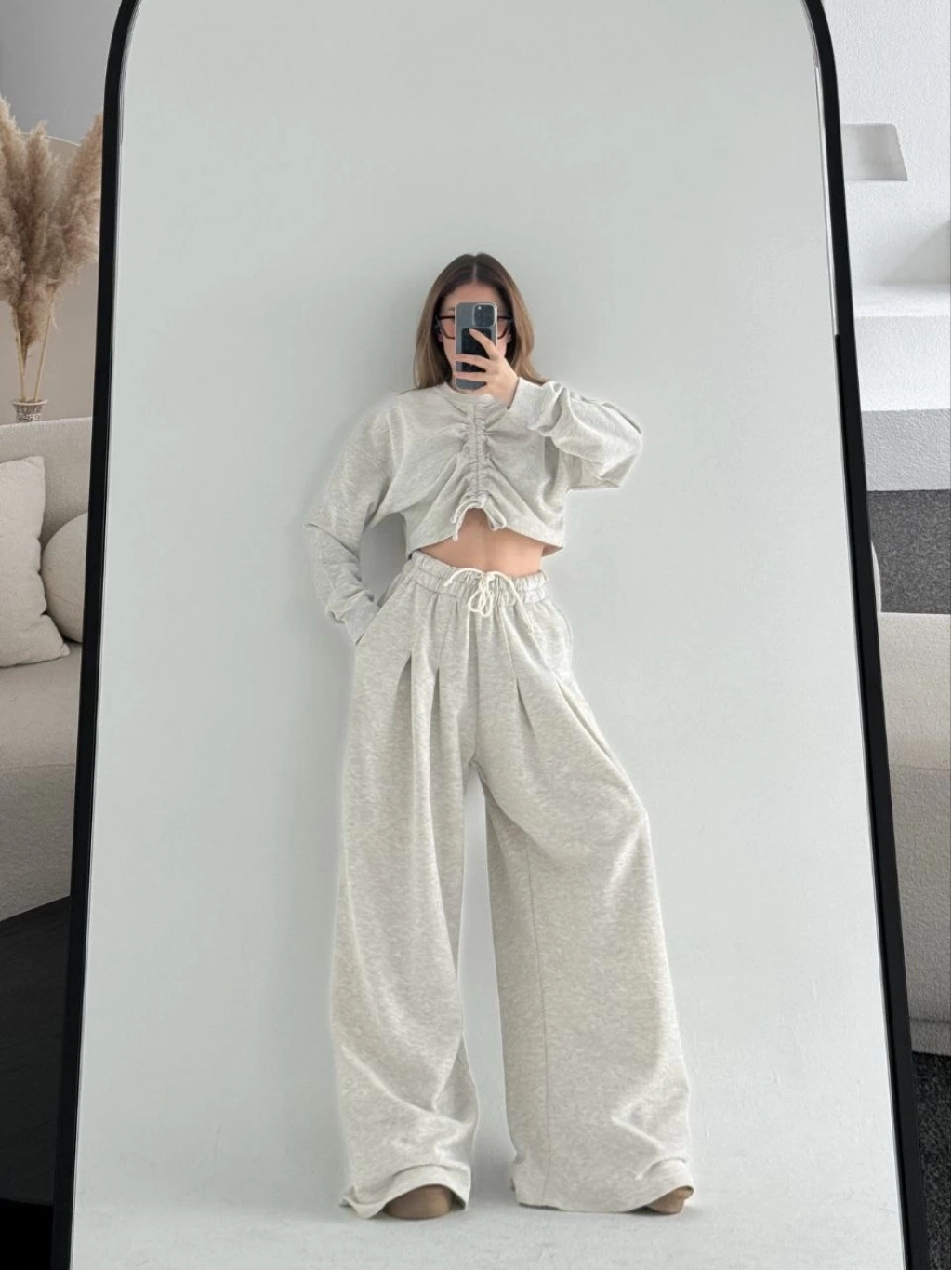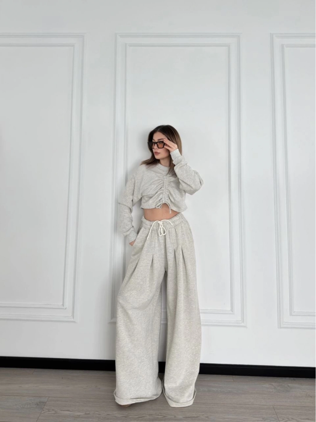Uzun Kollu Önü İp Büzgülü Crop ve Pantolon İkili Takım - Gri -