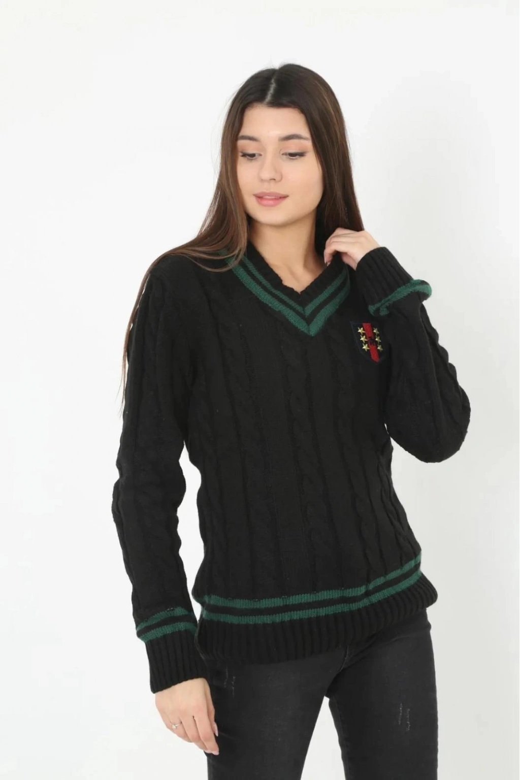 V Yaka Örgülü Kazak - Siyah -