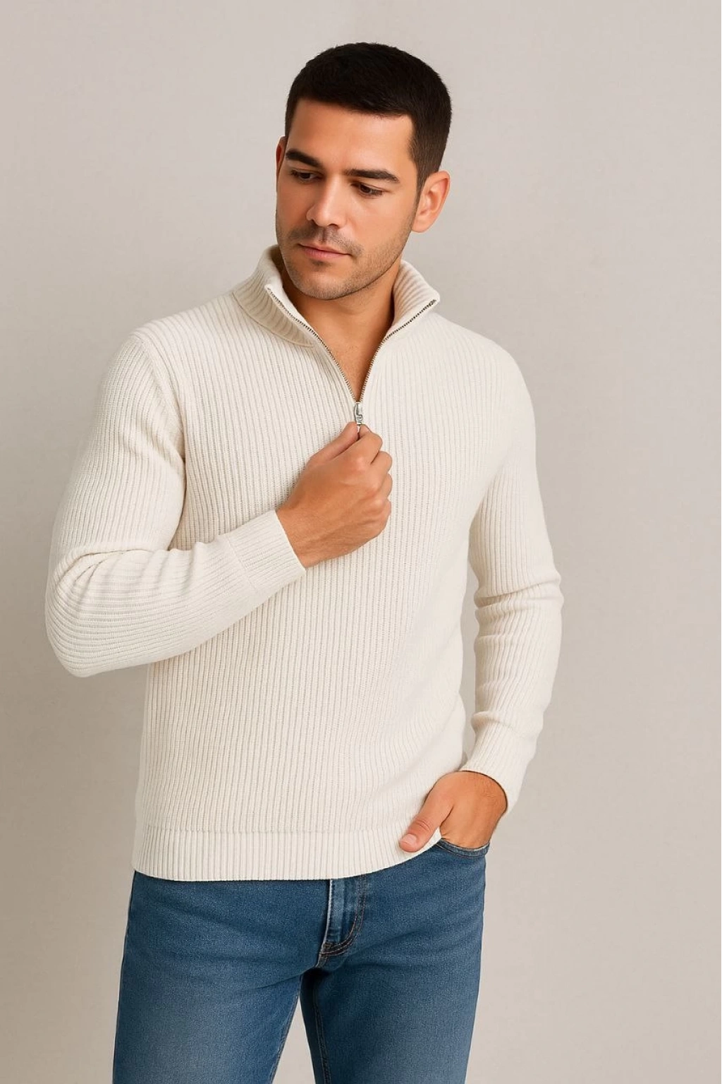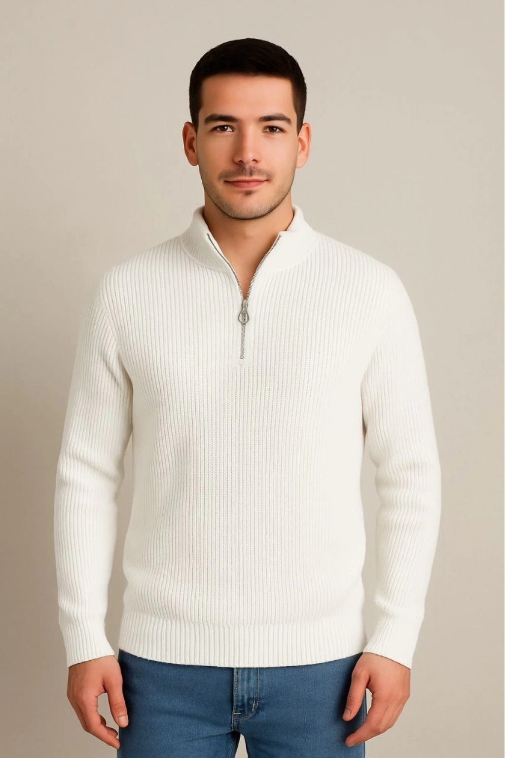 Yarım Fermuarlı Triko Kazak Beyaz -