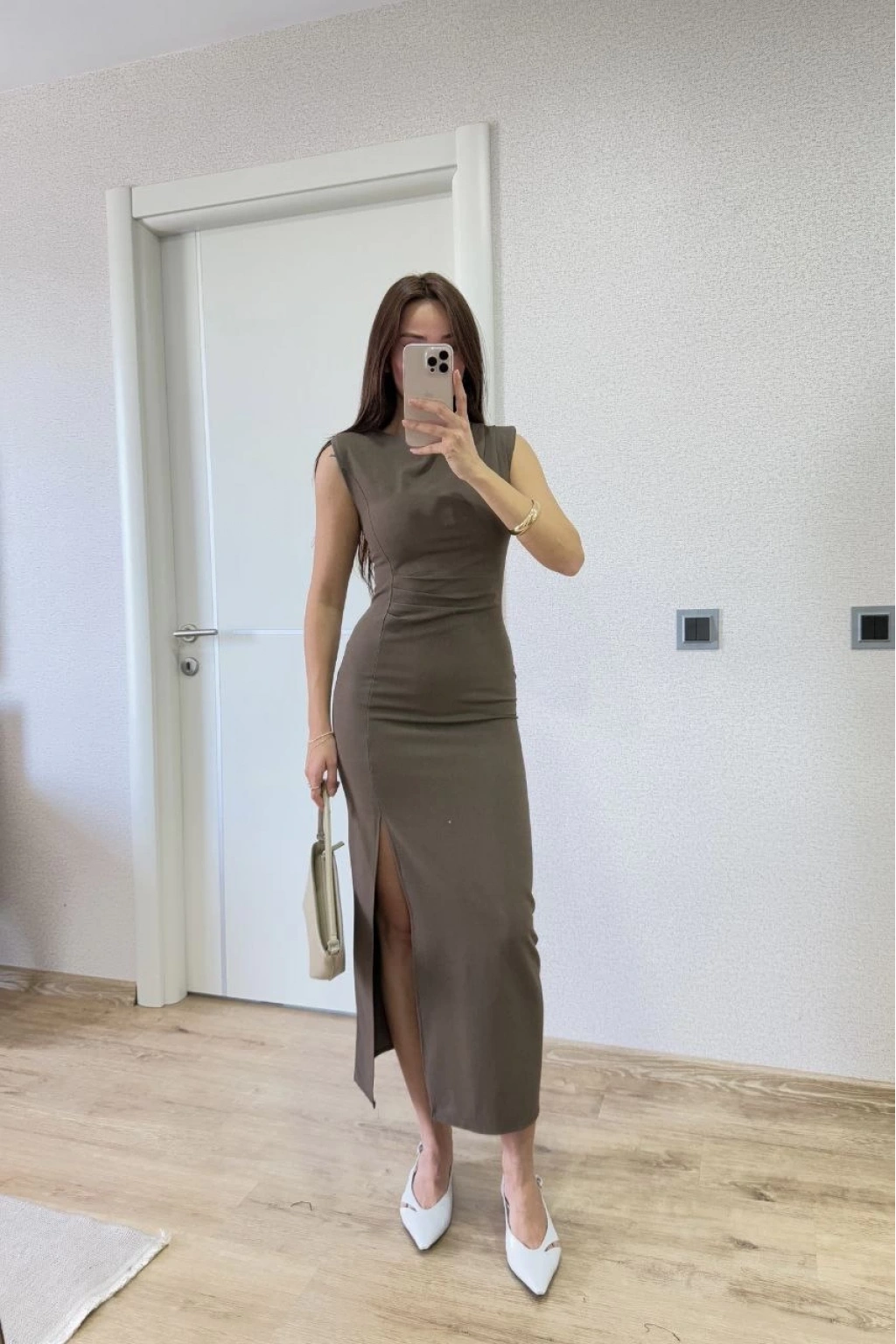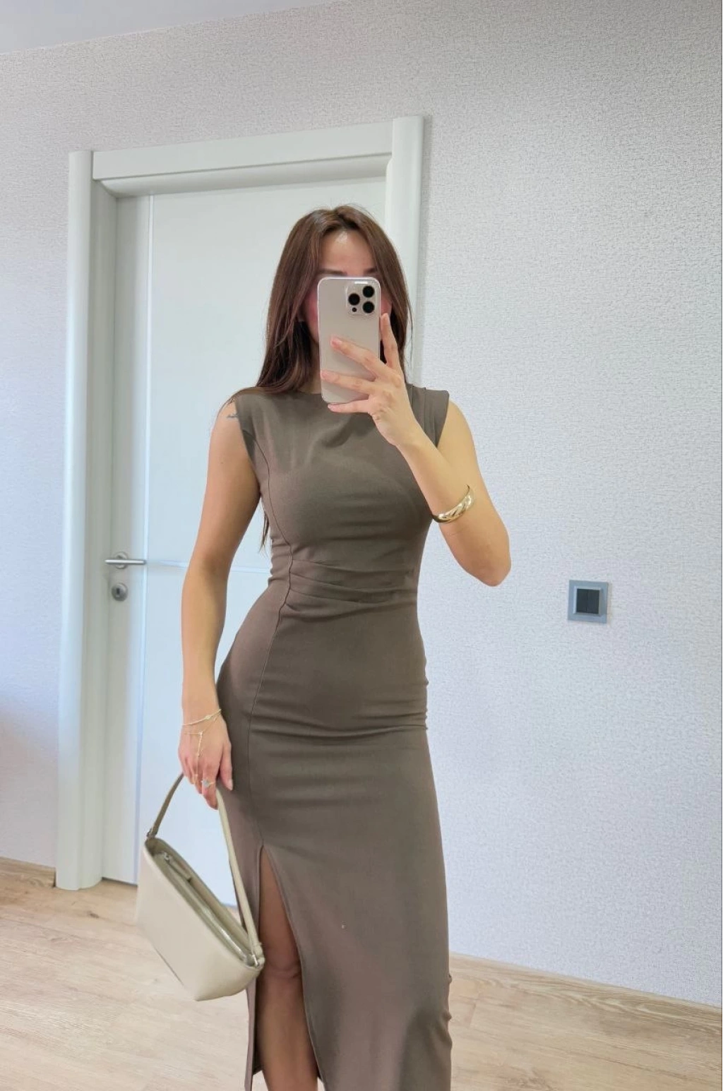 Yırtmaç Detaylı Sırtlı Kapalı Yandan Derin Yırtmaç Detaylı Kolsuz Elbise - Antrasit -