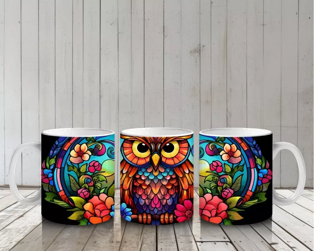 Vitray Baykuş Deseni – Renkli Sanat – Baskılı Kupa