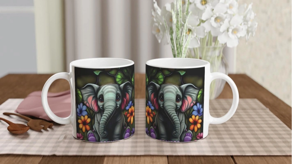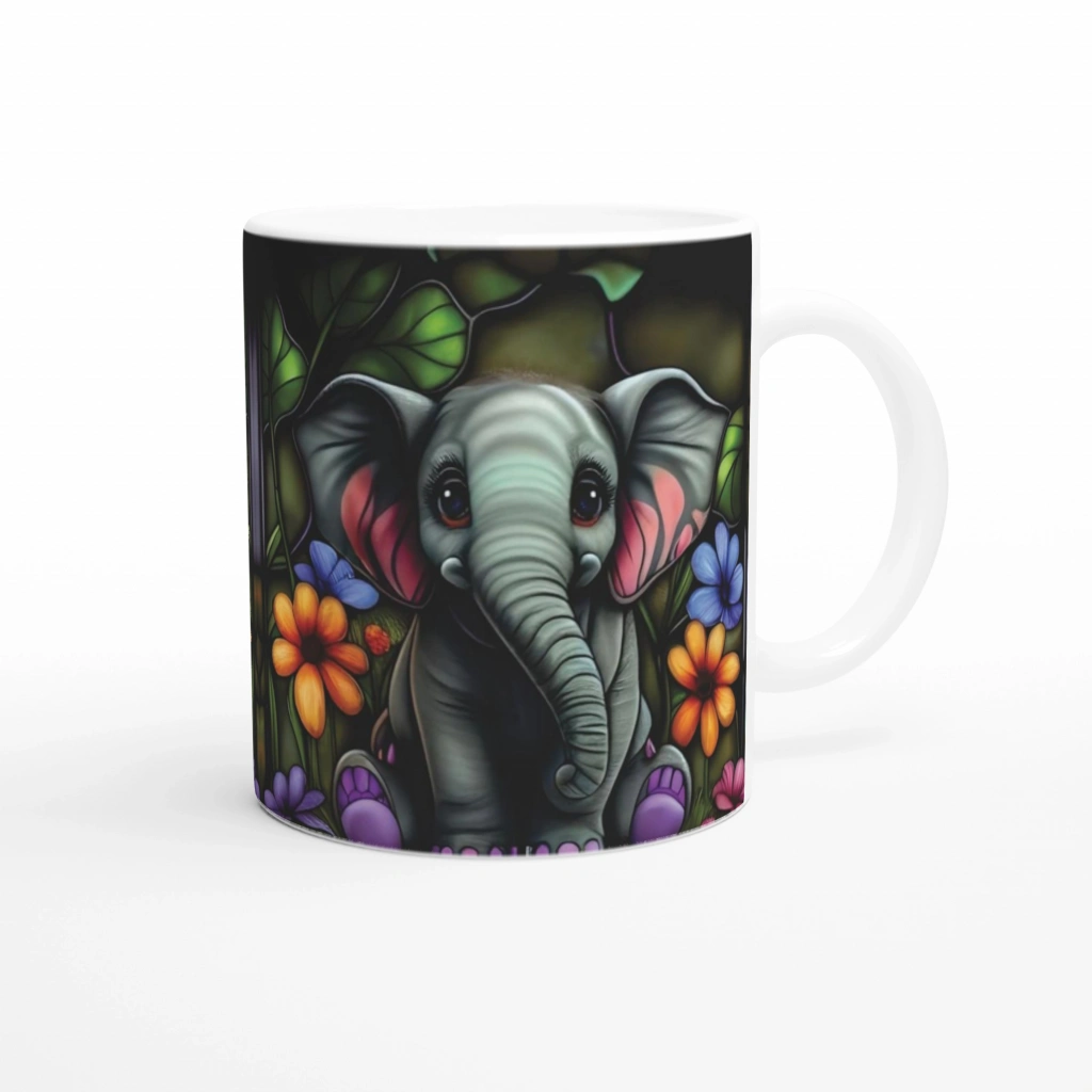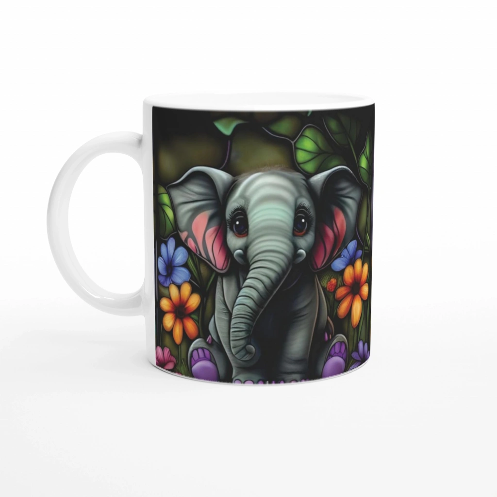rengârenk çiçekler ve filin masum bakışlarıyla kahve rutininizi mutluluğa dönüştürüyor.