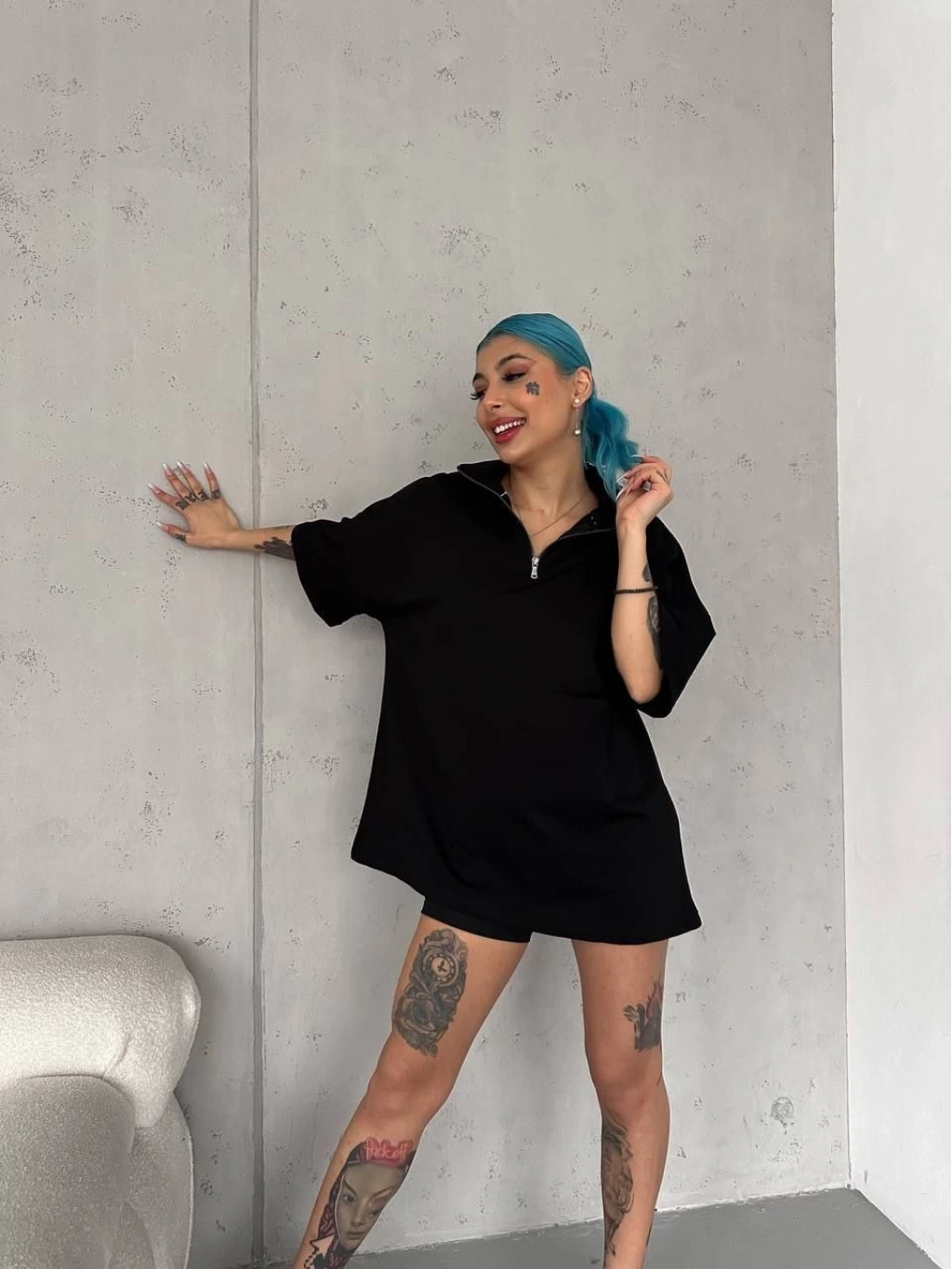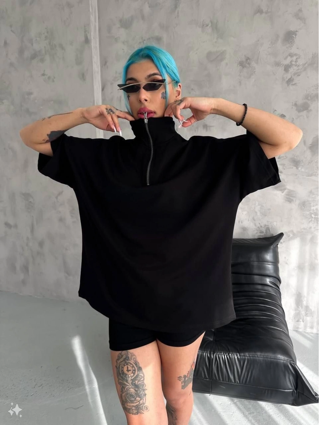 Yarım Fermuarlı Basic T-Shirt - Siyah -