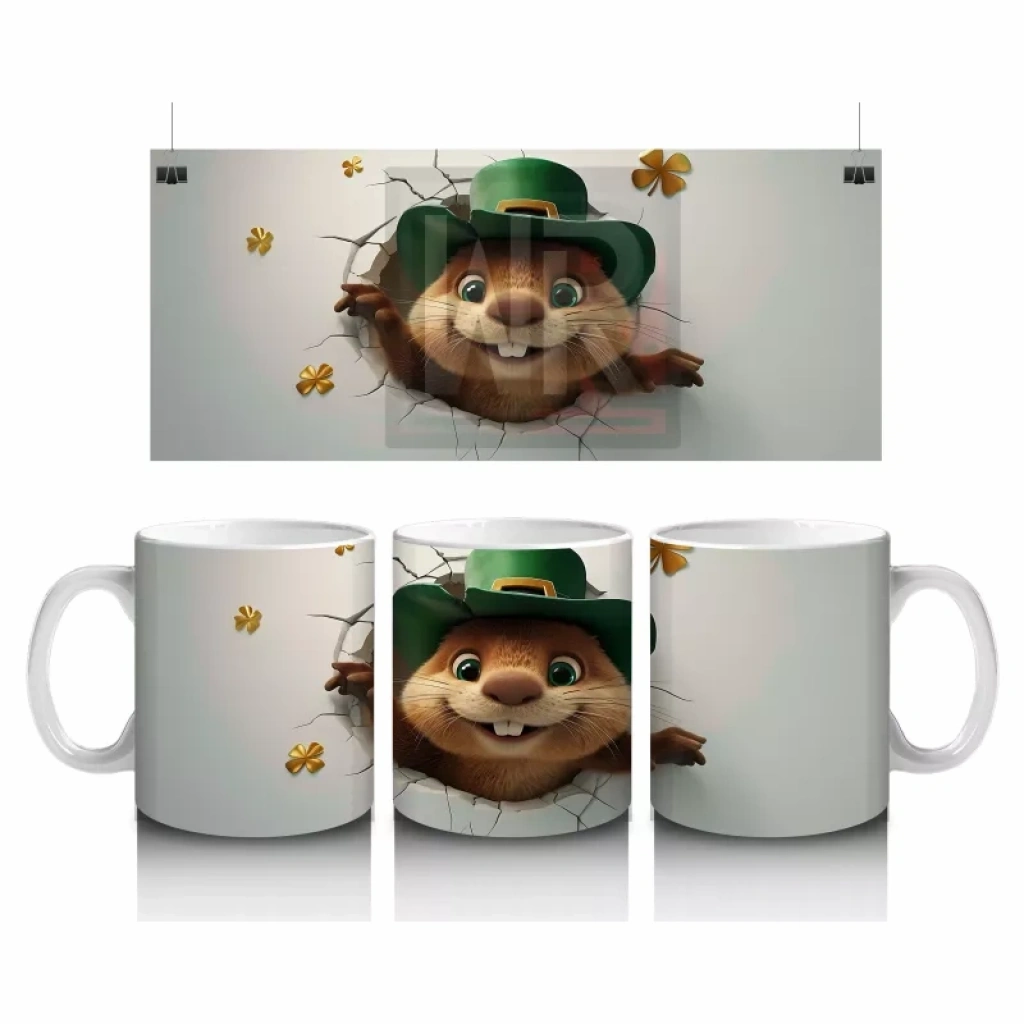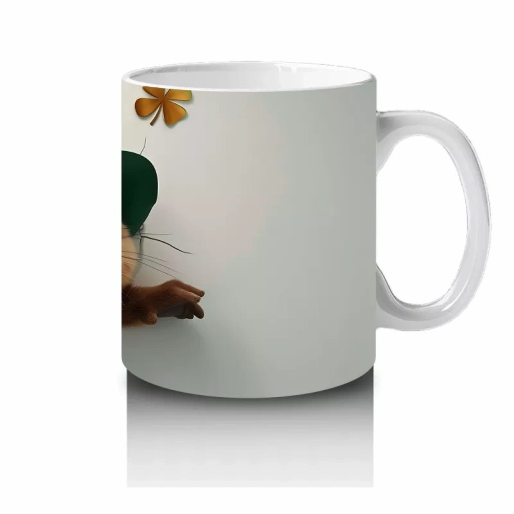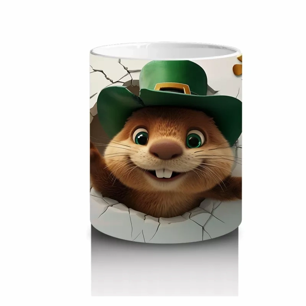 Yeşil şapkasıyla poz veren sevimli kunduz, doğa ve şans temalarını neşeli bir şekilde yansıtıyor. Eğlenceli ve tatlı detaylardan hoşlananlar için özel bir kupa tasarımı.