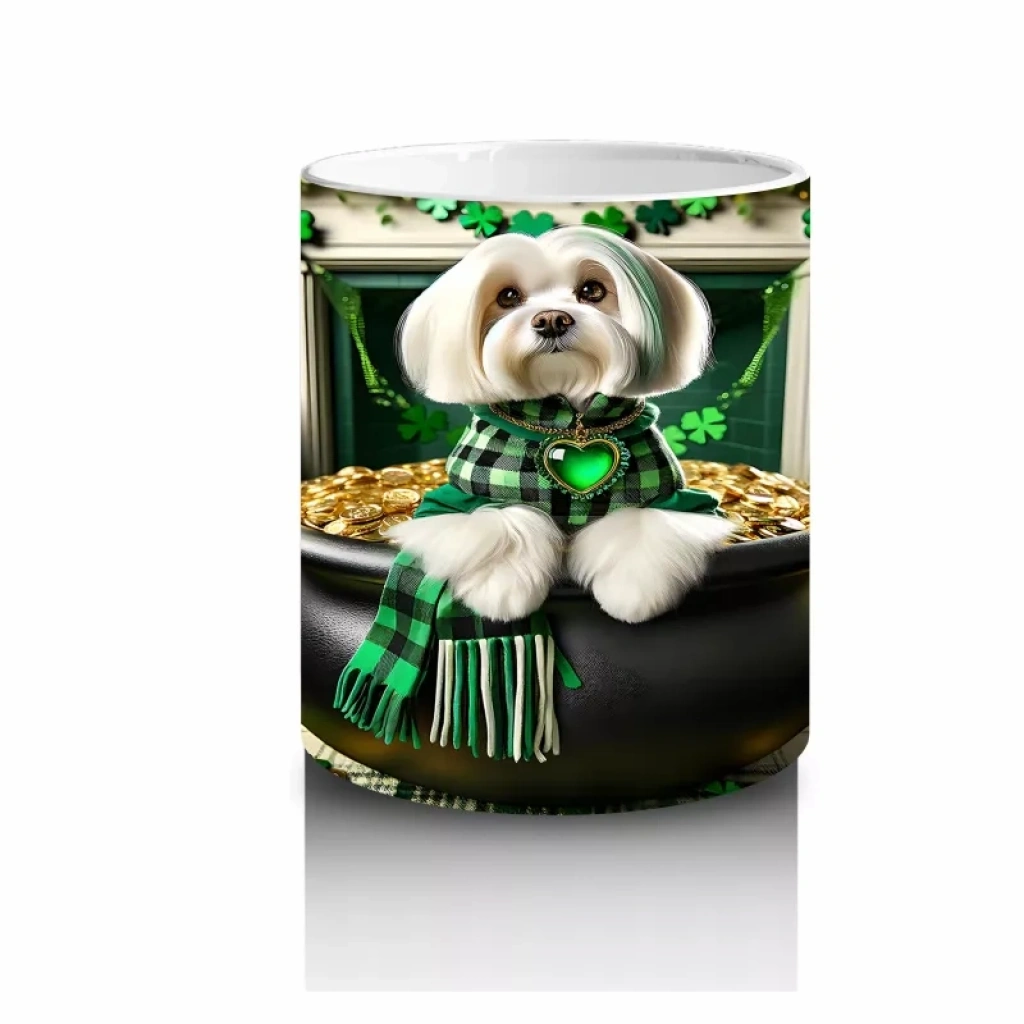 Yeşil Temalı Masada Oturan St. Patrick Bulldog – Baskılı Kahve Kupası