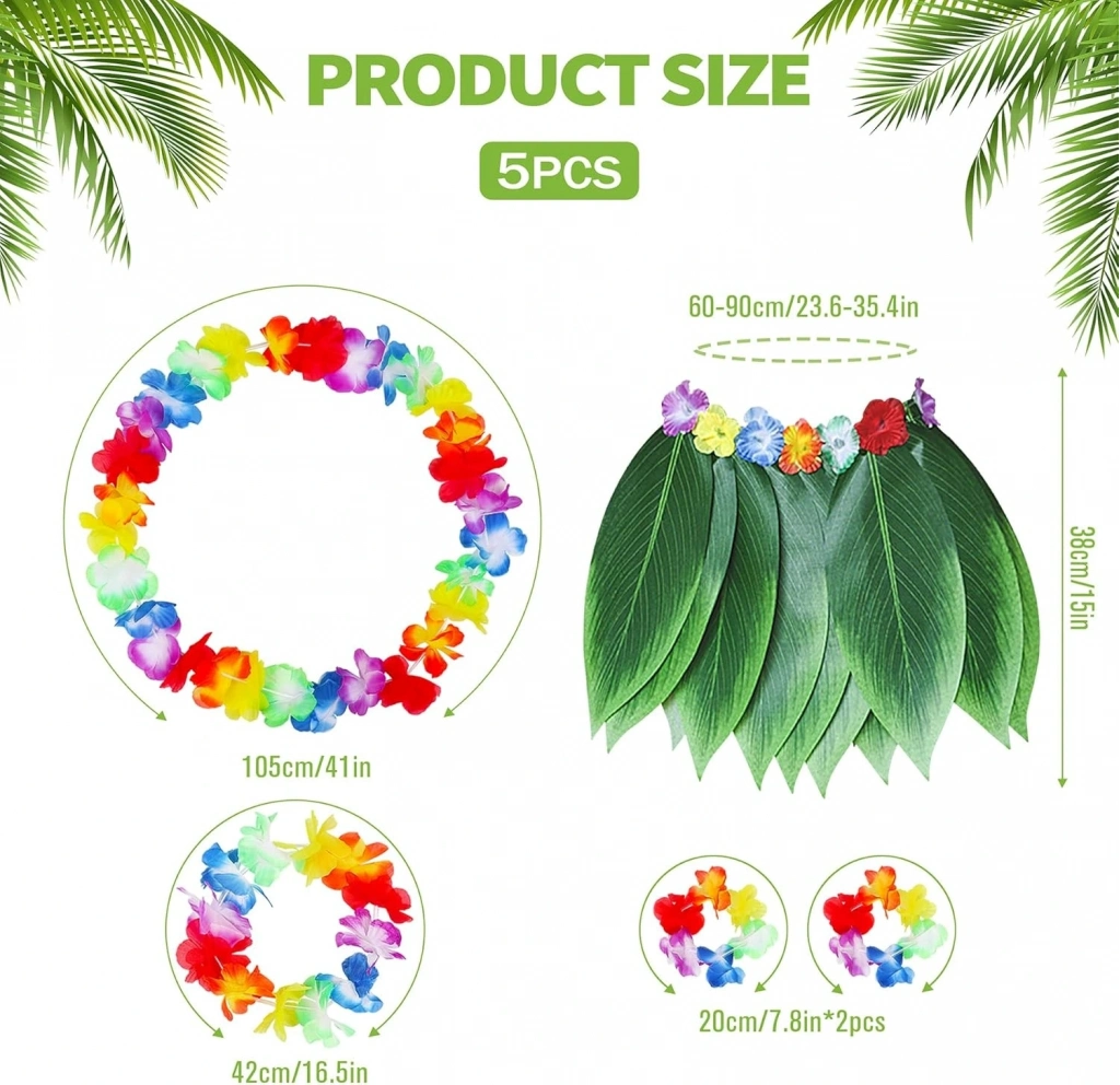 Hawaii temalı etkinliklerde, plaj partilerinde ve kostüm organizasyonlarında tropikal bir hava estirmek için mükemmel bir set! Hawaii Tropikal Yaprak Etek ve Aksesuar Seti, doğadan ilham alan tasarımıyla sizi adeta bir Hula dansçısına dönüştürecek.