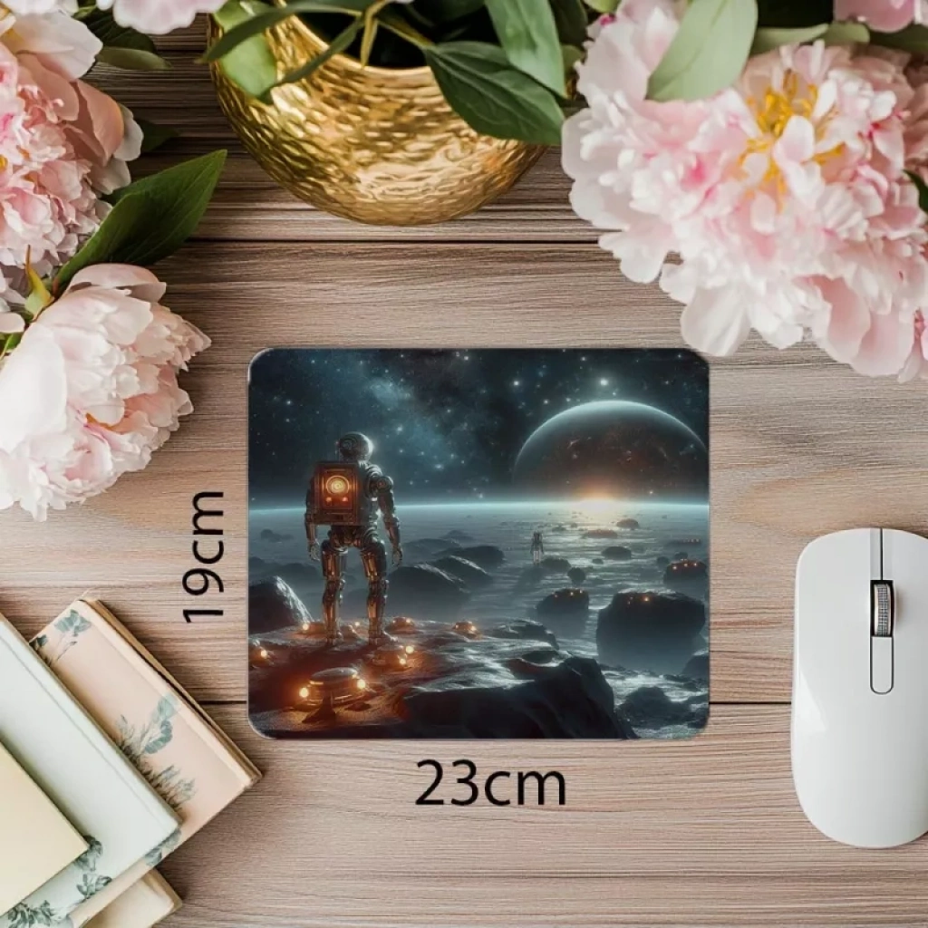 Yıldızlara dalgın dalgın bakan robot figürüyle tasarlanan bu mousepad, nostaljik ve duygusal bir uzay teması arayanlara hitap eder.
