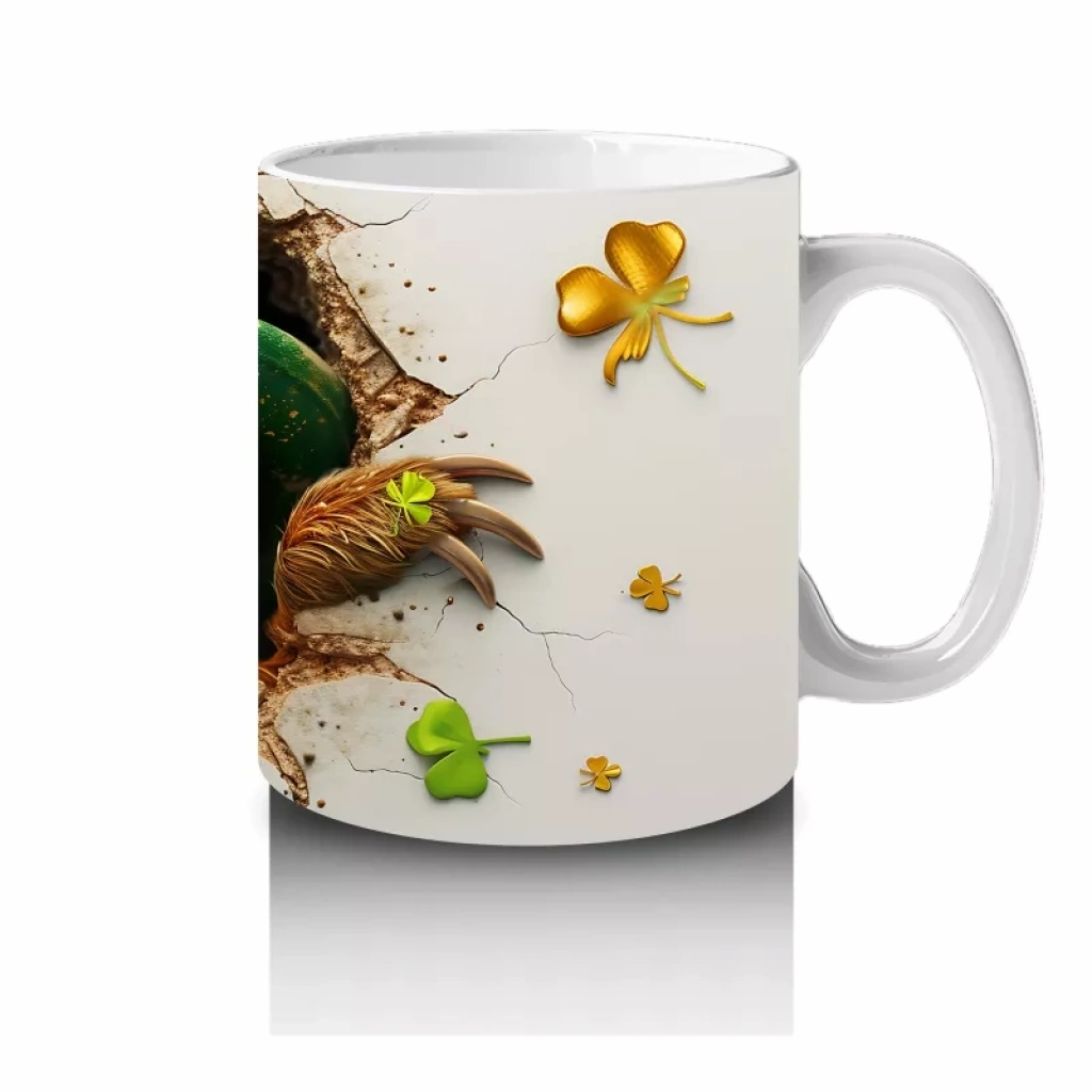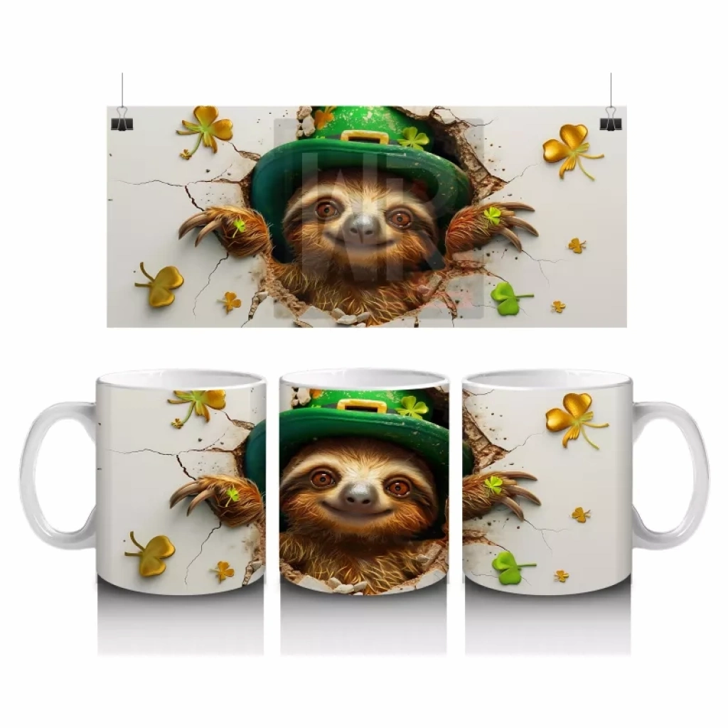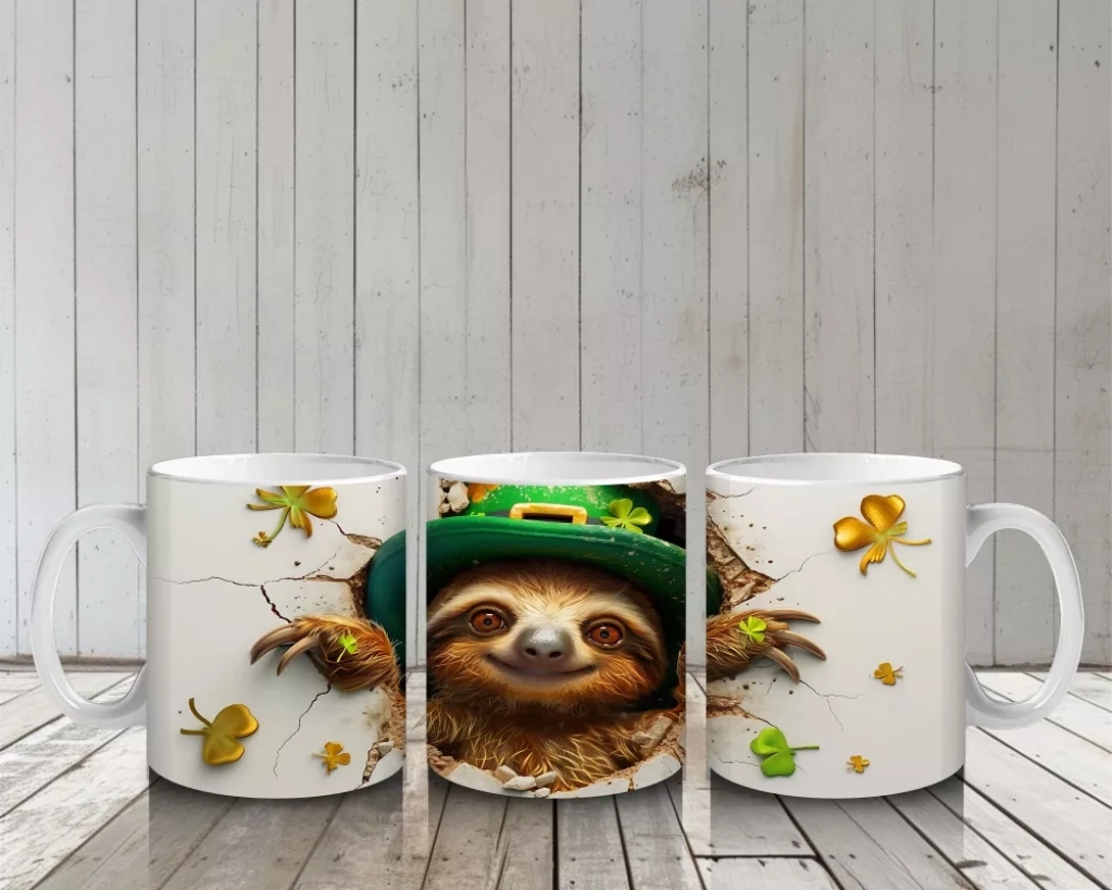 Yonca Yapraklarıyla Süslenmiş Gülümseyen Tembel Hayvan – Baskılı Kahve Kupası