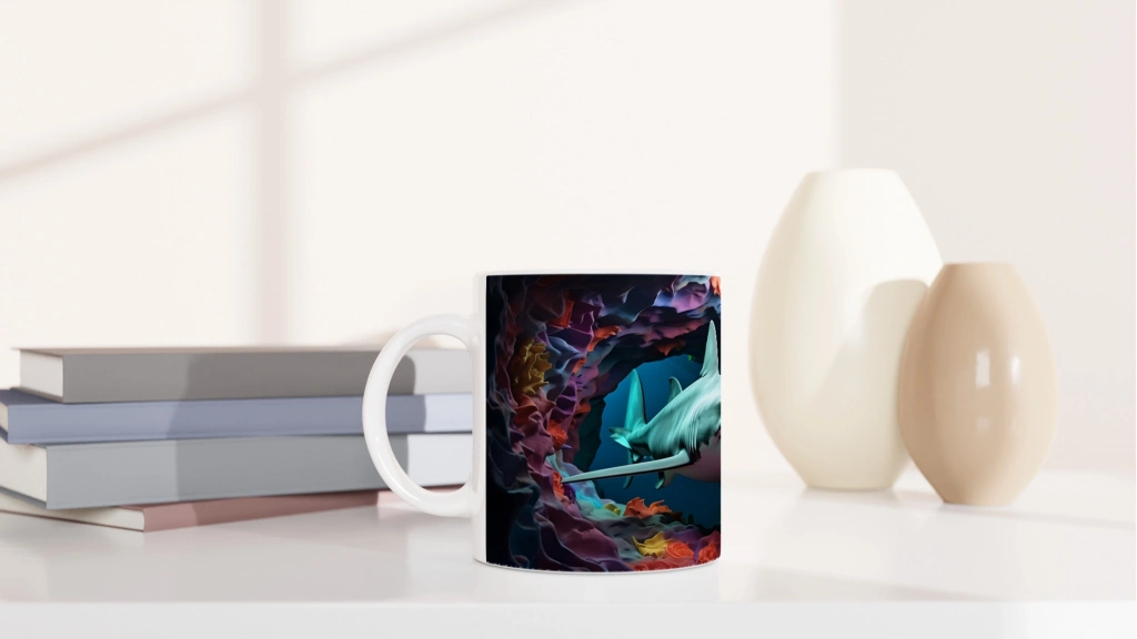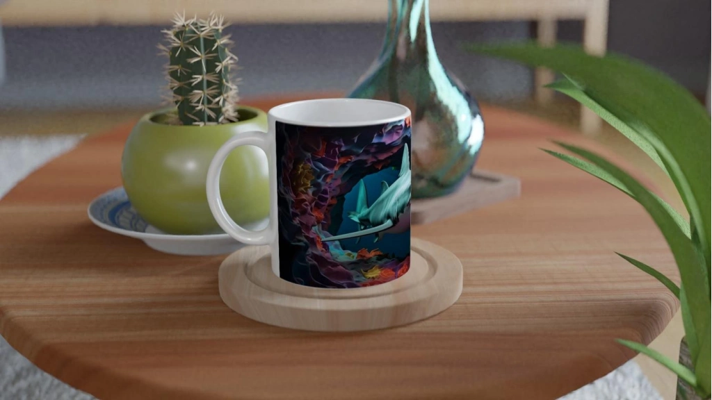 Yoğun renk kontrastları ve yumuşak geçişli mercan dokularıyla tasarlanan bu kupa bardak, hem sanatsal hem de tematik bir atmosfer sunuyor.