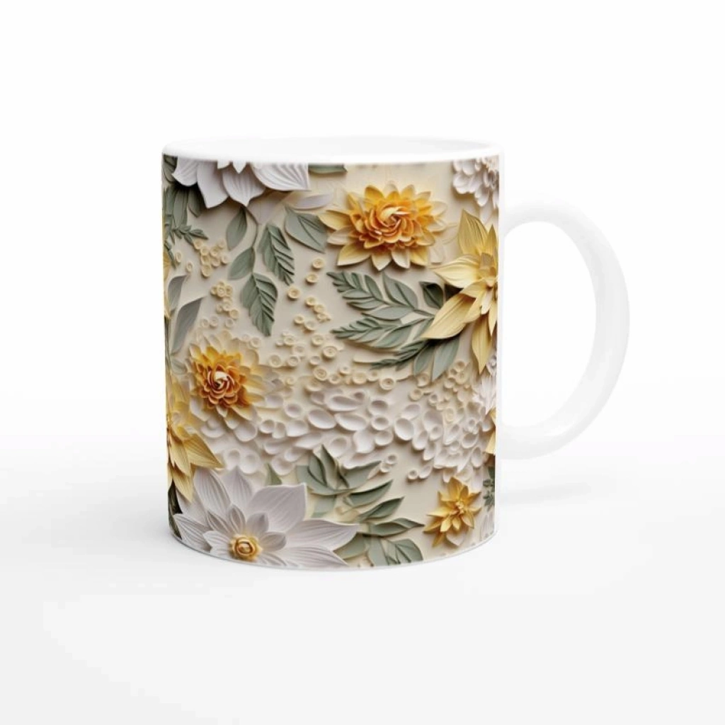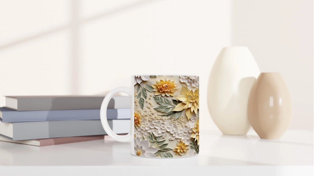 Doğal Işıkta Sarı Çiçekler Kupa Bardak, ince yaprak detayları ve üç boyutlu çiçek dokusuyla hem zarif hem sıcak bir atmosfer yaratır. Günlük kullanımda içeceklere doğa esintisi katmak isteyenler için harika bir seçim.