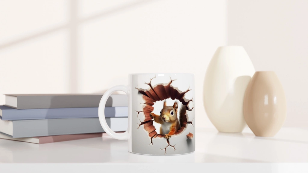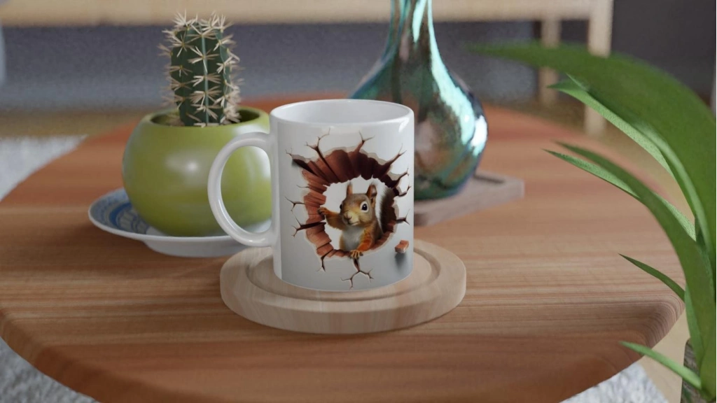 3D optik illüzyon efektiyle tasarlanmış bu sincap temalı kupa, mizahı ve sanatı bir araya getiriyor.