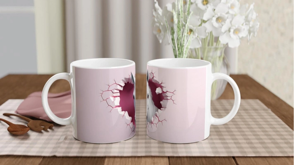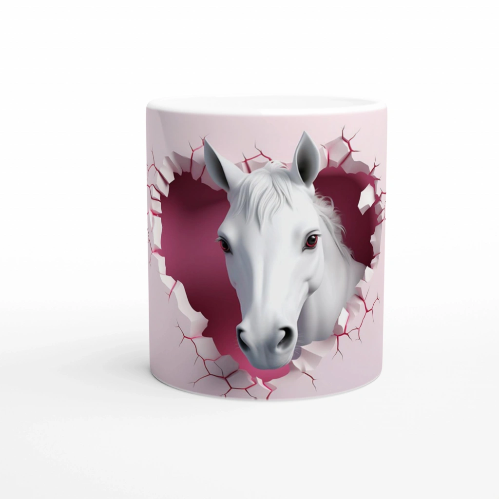 Duvarı delerek bakan bembeyaz bir at figürü, sade ama etkileyici bir estetik sunuyor. Hayvanseverler ve doğaya tutkun ruhlar için ideal bir kupa tasarımı.