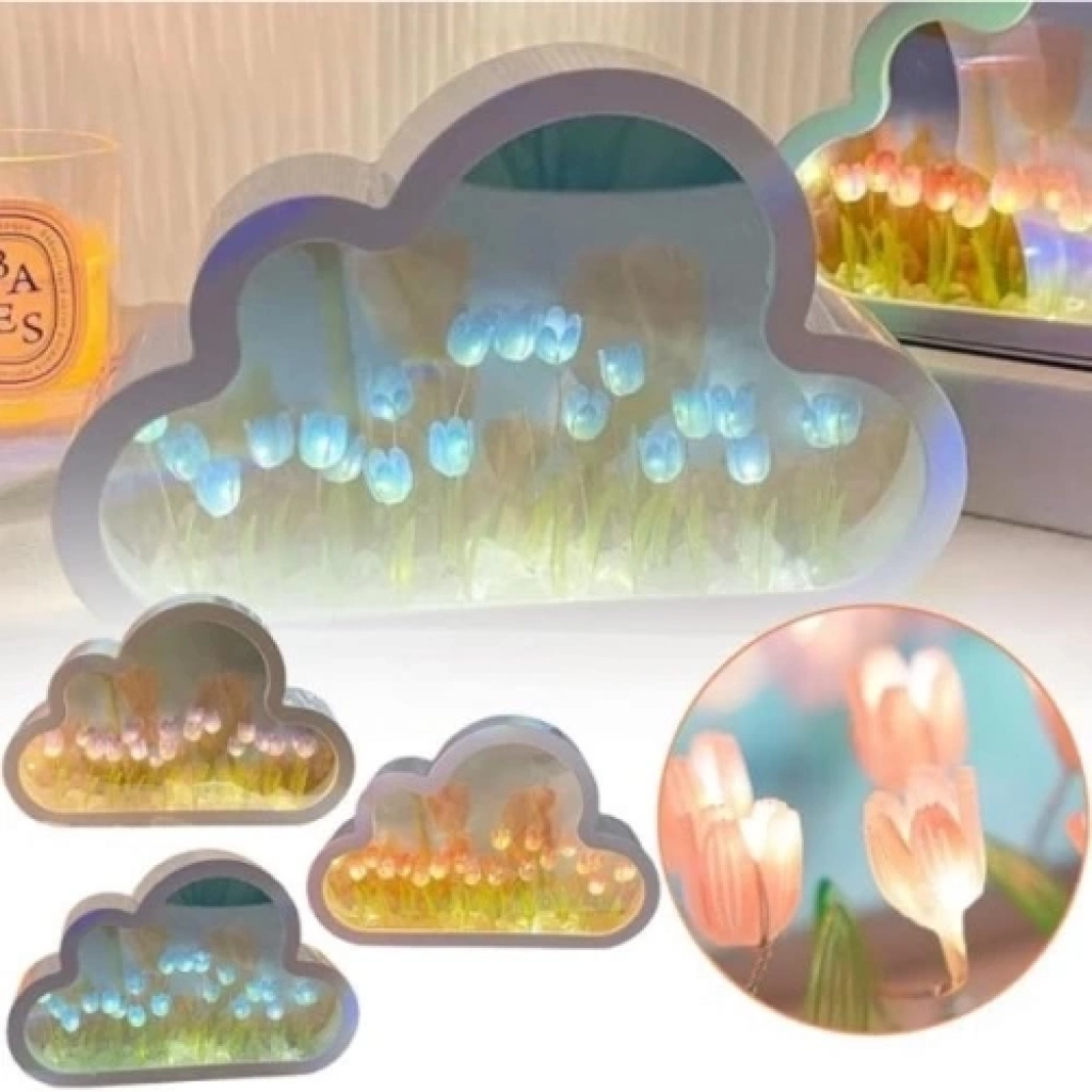 EL YAPIMI BÜYÜK BOY BULUT GECE LAMBASIÜrün ÖzellikleriBu pembe lale gece lambası, odanızı daha konforlu hale getiren sevimli bir dekorasyondur. Bulut aynalı lale lambası, hem masaüstü dekorasyonu hem de küçük bir ayna olarak kullanılabilir. Her çiçek istediğiniz konuma ayarlanabilir ve iki adet AA pil ile çalışır (piller dahil değildir).Ürün ÖlçüleriGenişlik: 20 cmUzunluk: 13 cmPaket İçeriği1 adet El Yapımı Büyük Boy Bulut Gece Lambası