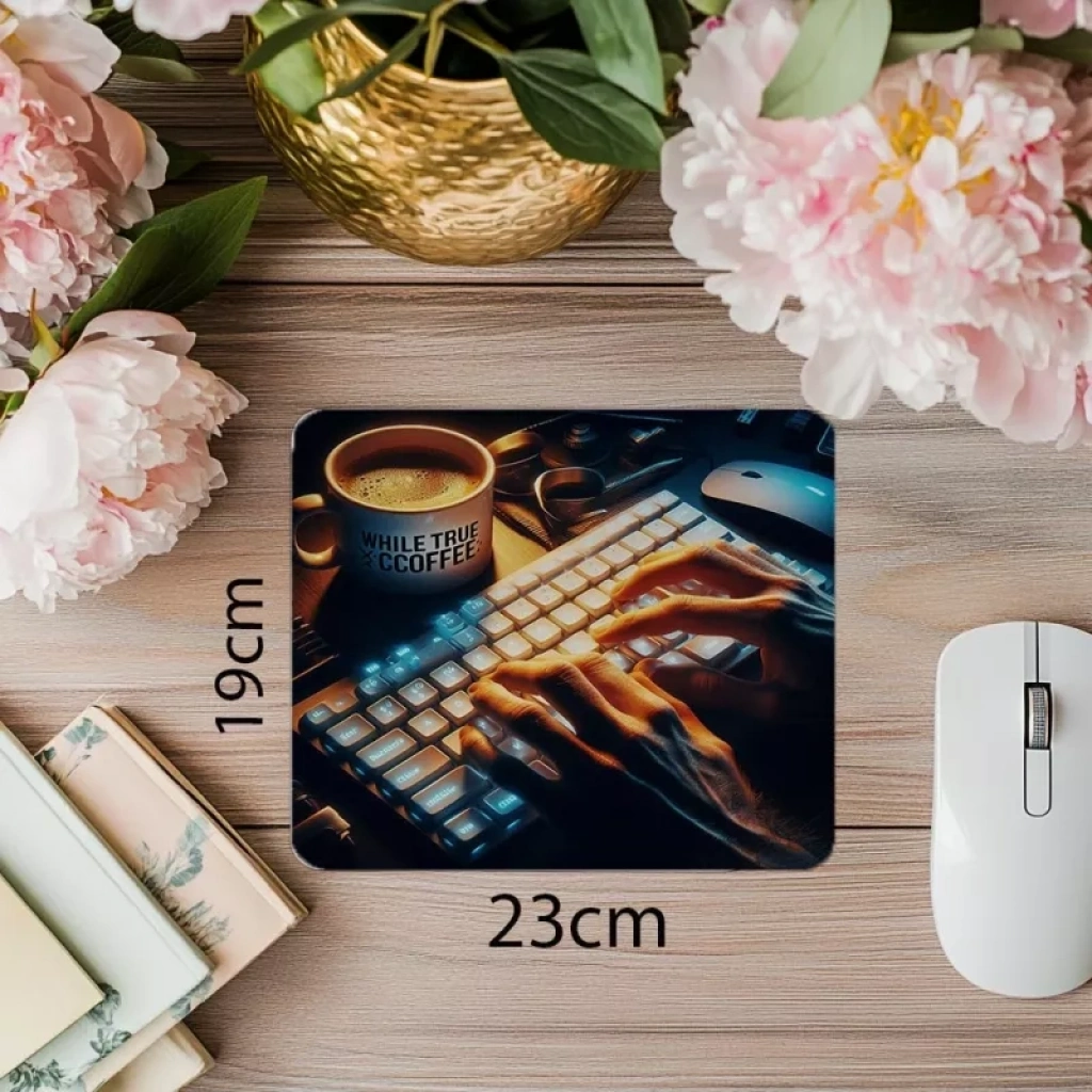 El yazısı stiliyle yazılmış notlar ve espresso fincanıyla süslenen bu mouse pad, yazılım tutkusunu sıcak bir dokunuşla yansıtır.