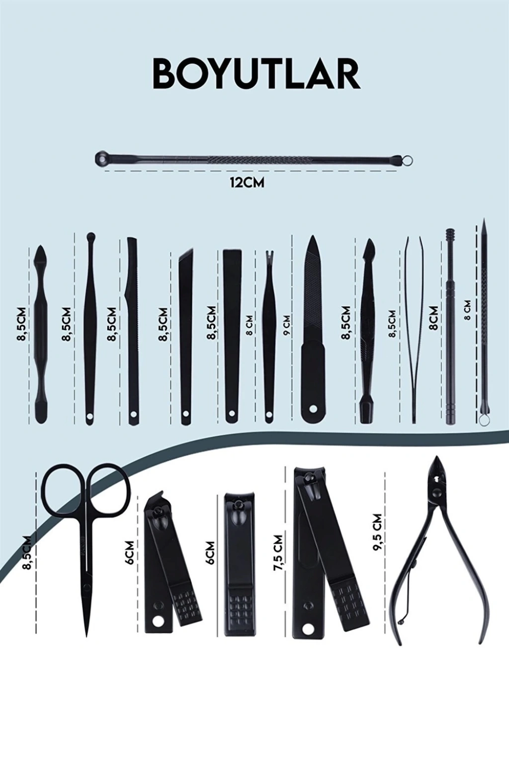 • 1 büyük tırnak makası1 küçük tırnak makası1 sivri uç tırnak makası ( Tırnaklara şekil vermek için )1 çift uçlu komedon1 törpü1 et ittirici1 çift taraflı tırnak kaldırma aleti1 makas1 pedikür bıçağı ( ayak tabanları için )1 çarpraz pedikür bıçağı ( ayak tabakları için )1 kavisli pedikür bıçağı ( ayak tabanları için )1 V şeklinde et itme ( Tırnak çevresinde ki ölü deriyi temizleme )1 itme çubuğu ( Tırnak içinde ki ve çevresinde ki kirleri temizler )1 tırnak temizleme 1 cımbız1 iğneli komedon1 kulak temizleme