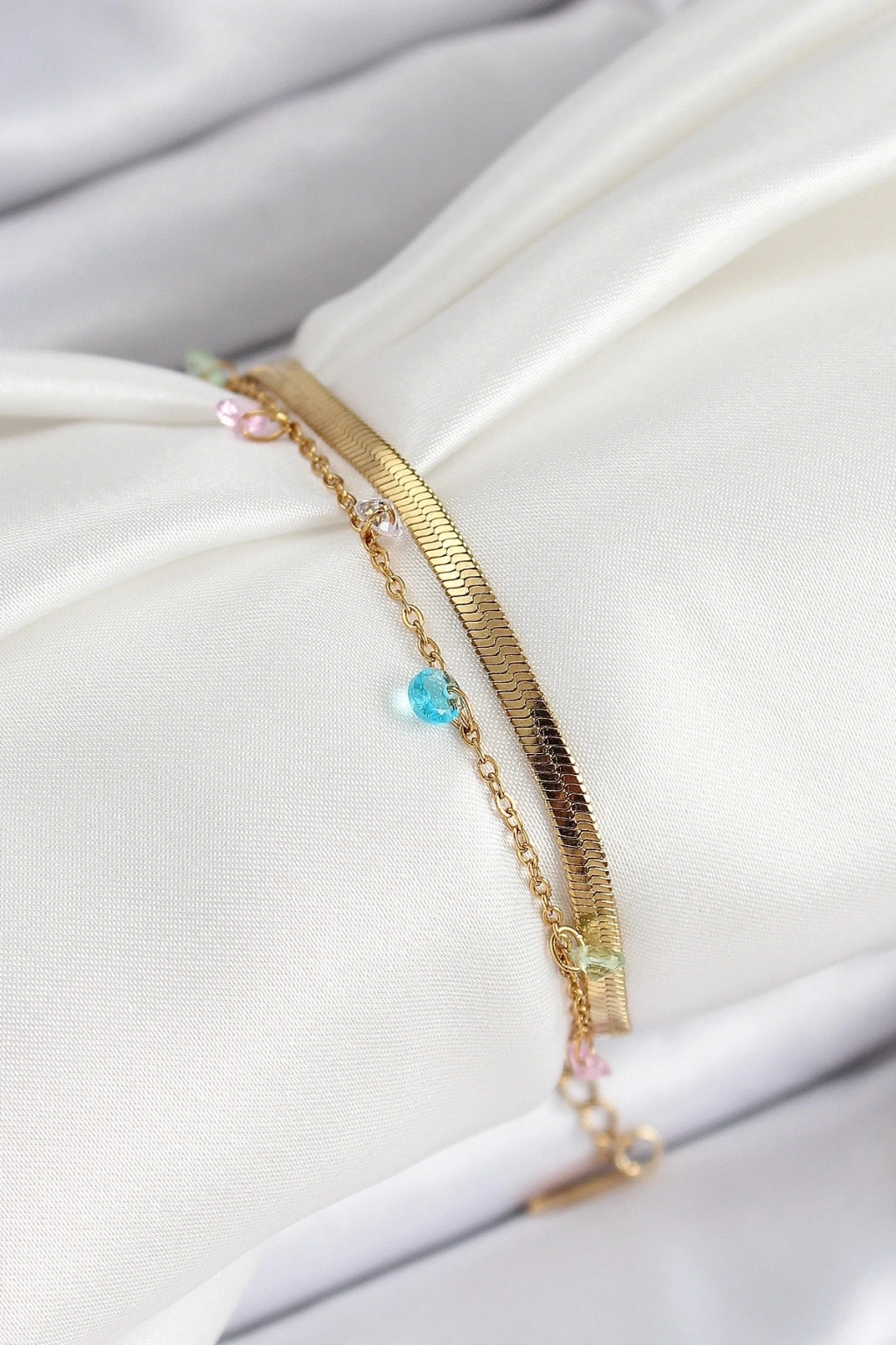 316L Çelik Gold Renk Karışık Renkli Kristal Taşlı 2'li Kadın Bileklik