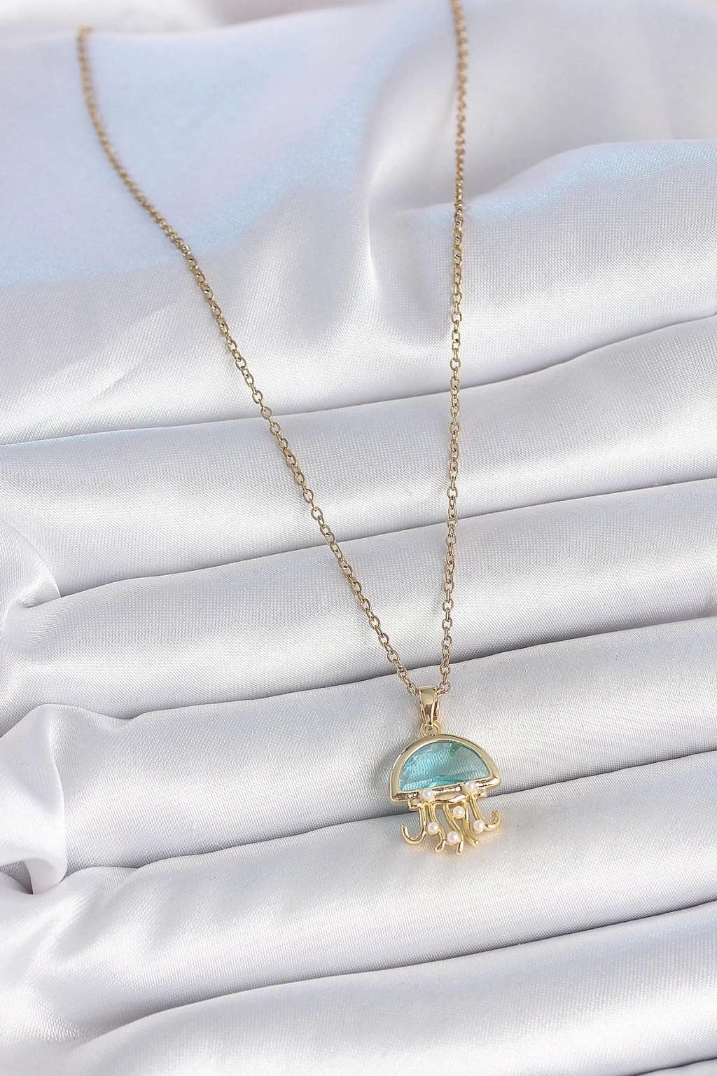316L Çelik Gold Renk Mavi Taşlı Deniz Anası Model İnci Detay Kadın Kolye