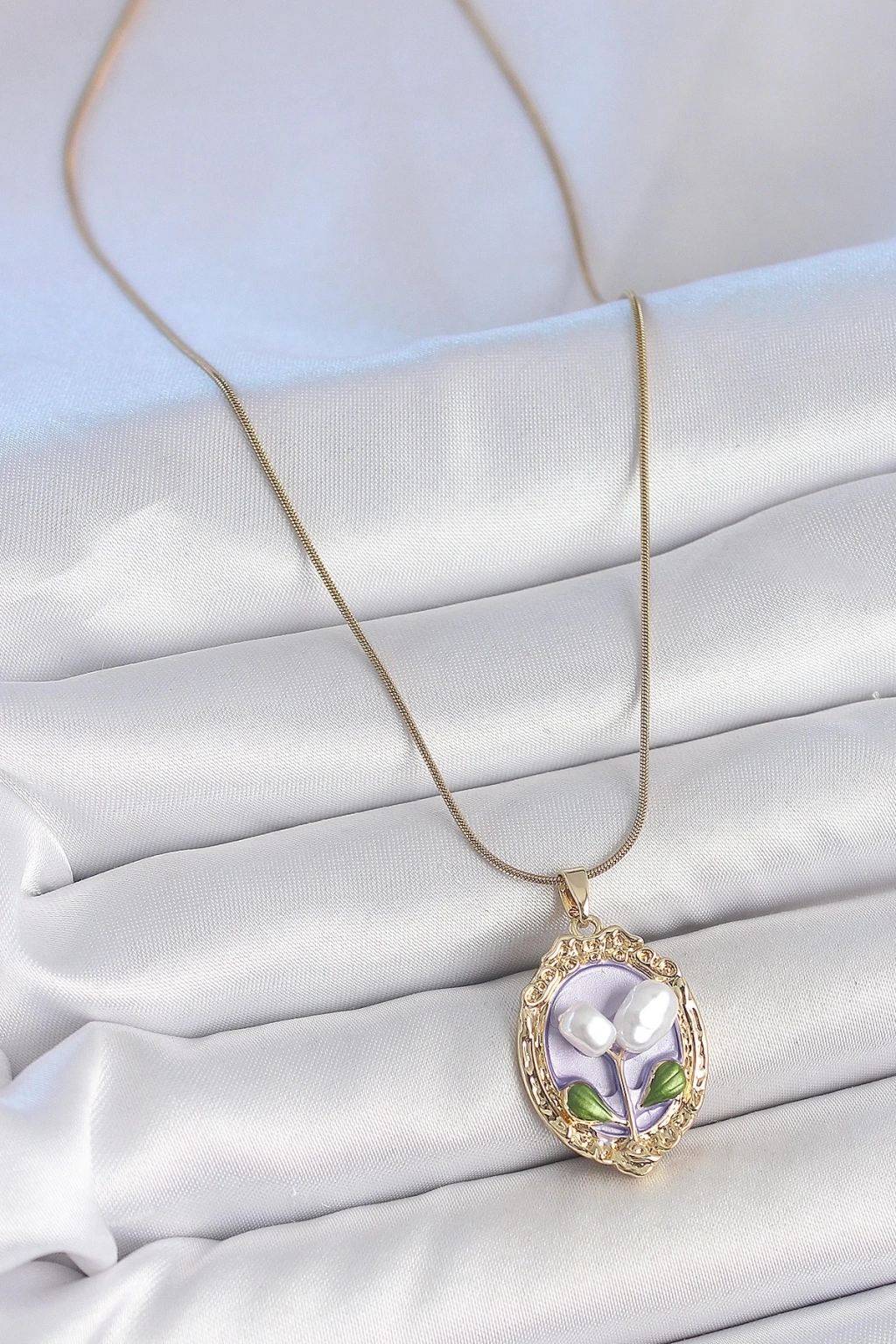 316L Çelik Gold Renk Mor İncili Çiçek İşlemeli Portre Model Kadın Kolye