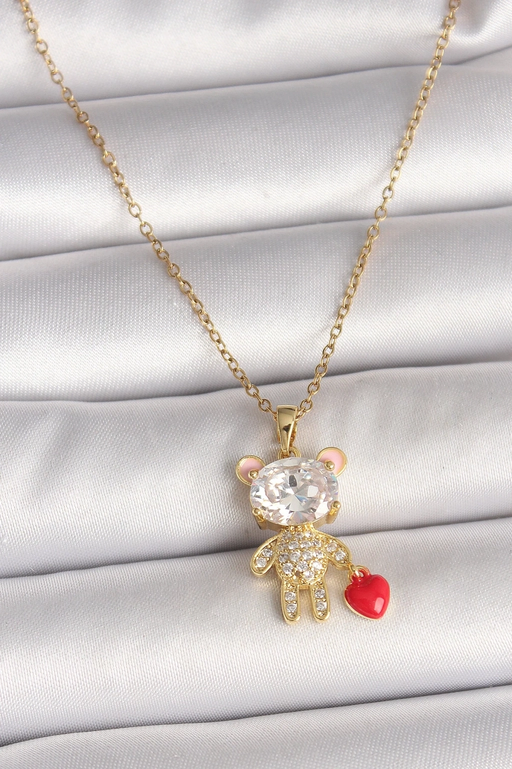 316L Çelik Gold Renk Zincir Zirkon Taşlı Ayıcık Model Kırmızı Kalp Detay Kadın Kolye