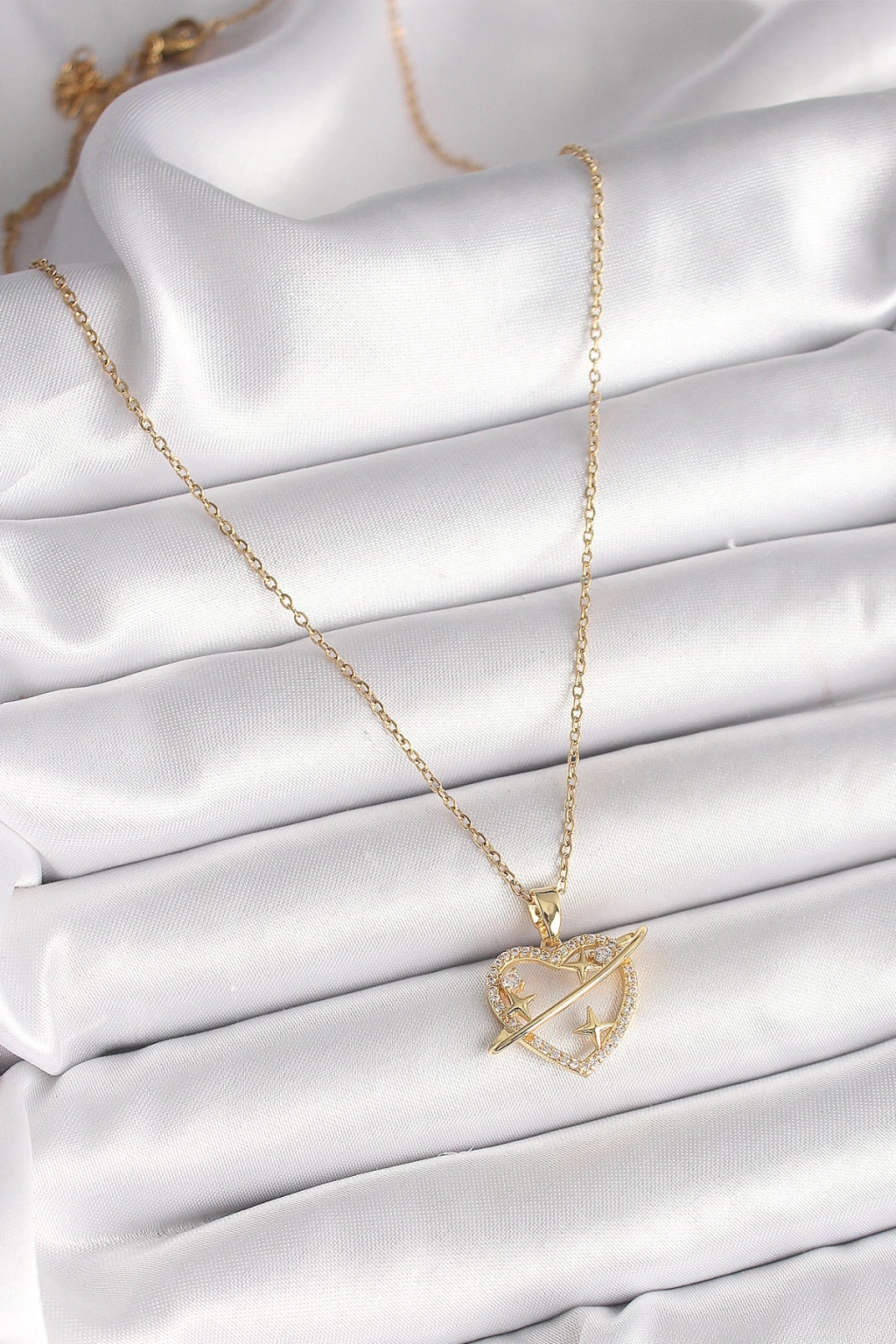316L Çelik Gold Renk Zincir Zirkon Taşlı Kalp Model Yıldız Detay Kadın Kolye