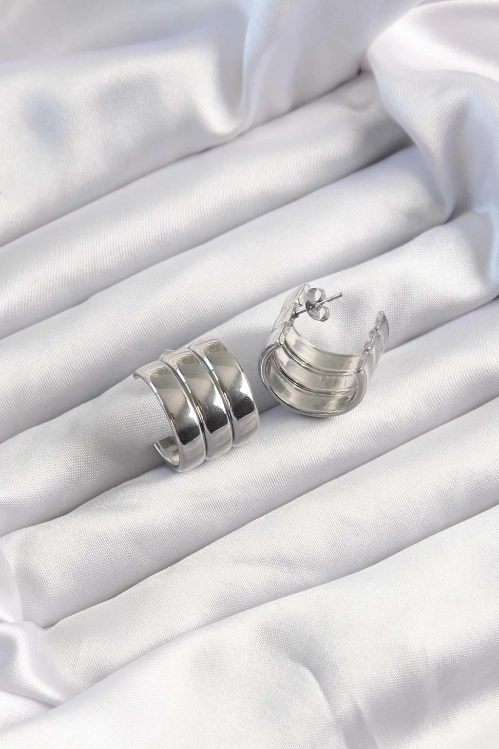 316L Çelik Gümüş Renk 3lü Görünüm Bombe Model Yarım Halka Küpe