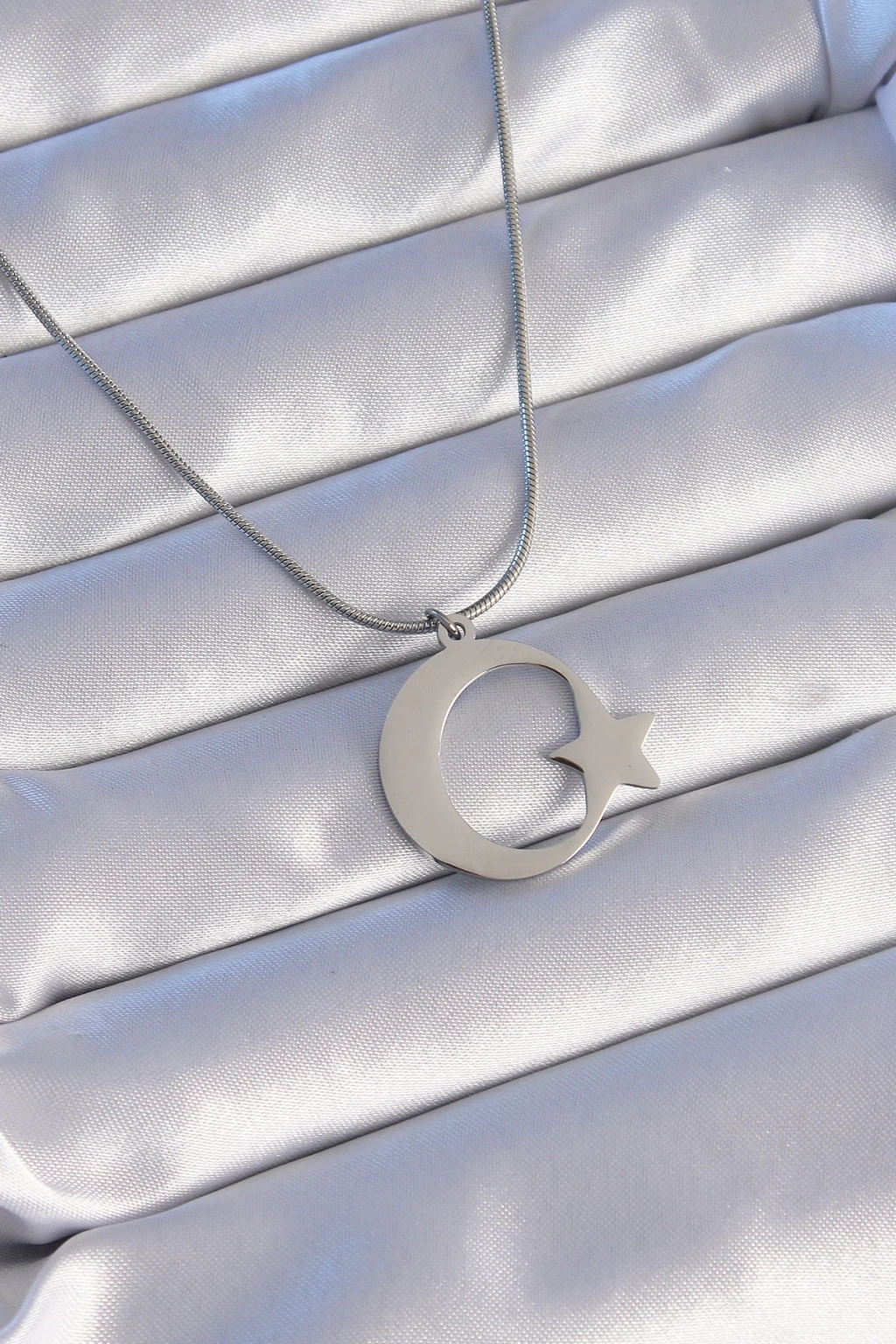 316L Çelik Gümüş Renk Ay Yıldız Model Unisex Kolye