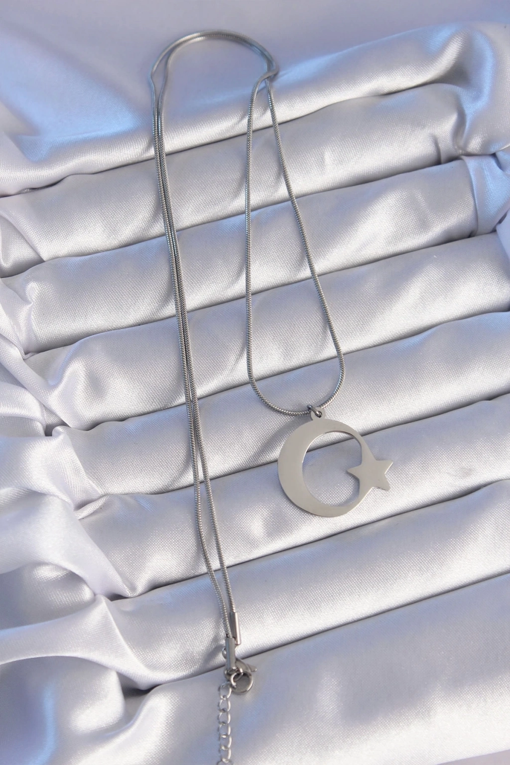 316L Çelik Gümüş Renk Ay Yıldız Model Unisex Kolye