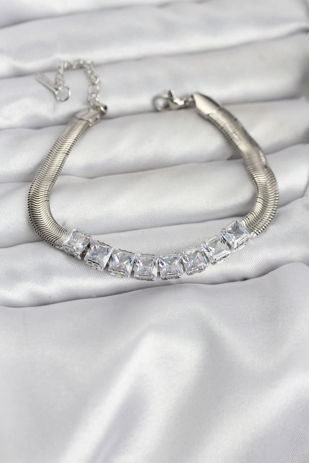316L Çelik Gümüş Renk Kare Zirkon Taşlı Yılan Zincirli Kadın Bileklik
