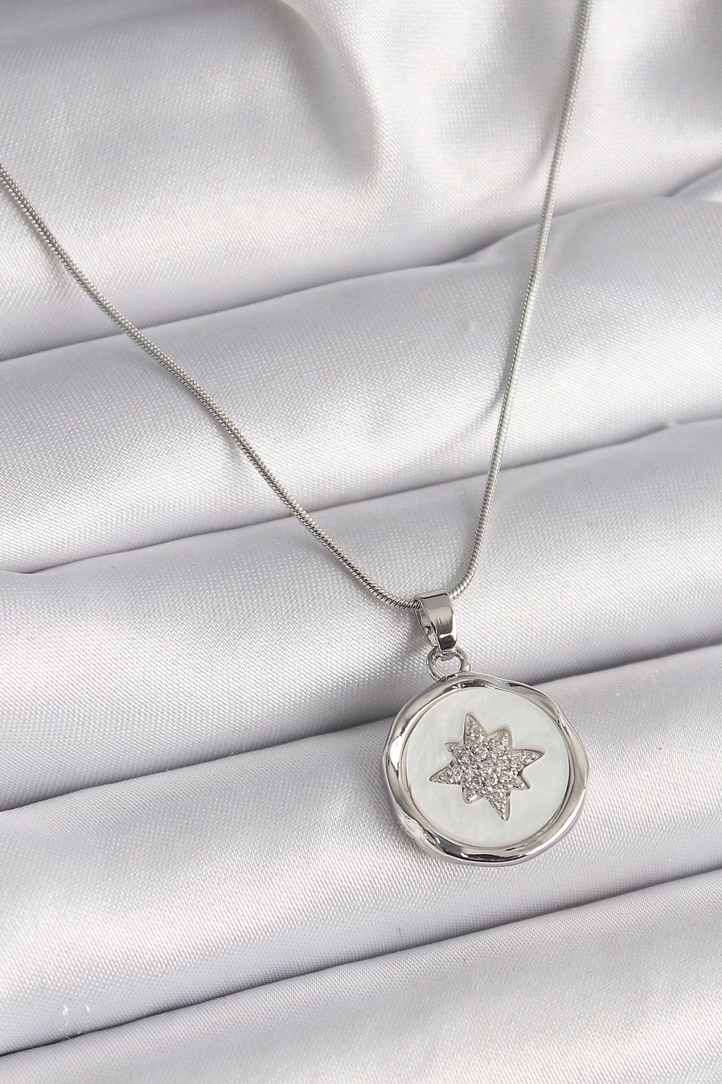 316L Çelik Gümüş Renk Zincir Beyaz Sedefli Zirkon Taşlı Yıldız İşleme Model Kadın Kolye