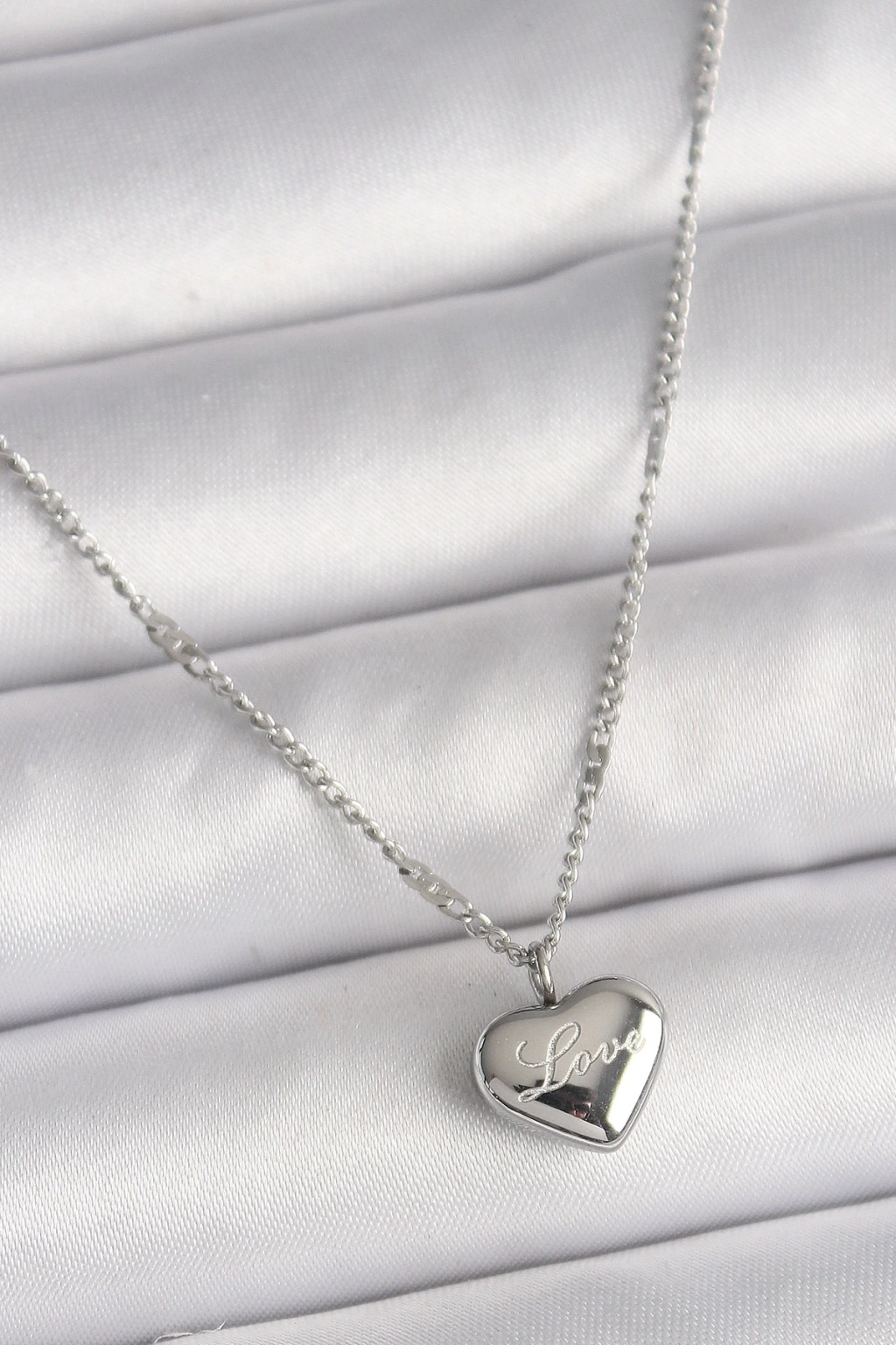 316L Çelik Gümüş Renk Zincir Love İşleme Kalp Figür Kadın Kolye