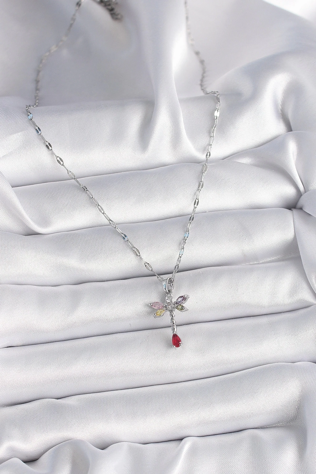 316L Çelik Gümüş Renk Zincir Renkli Zirkon Taşlı Yusufçuk Model Kadın Kolye